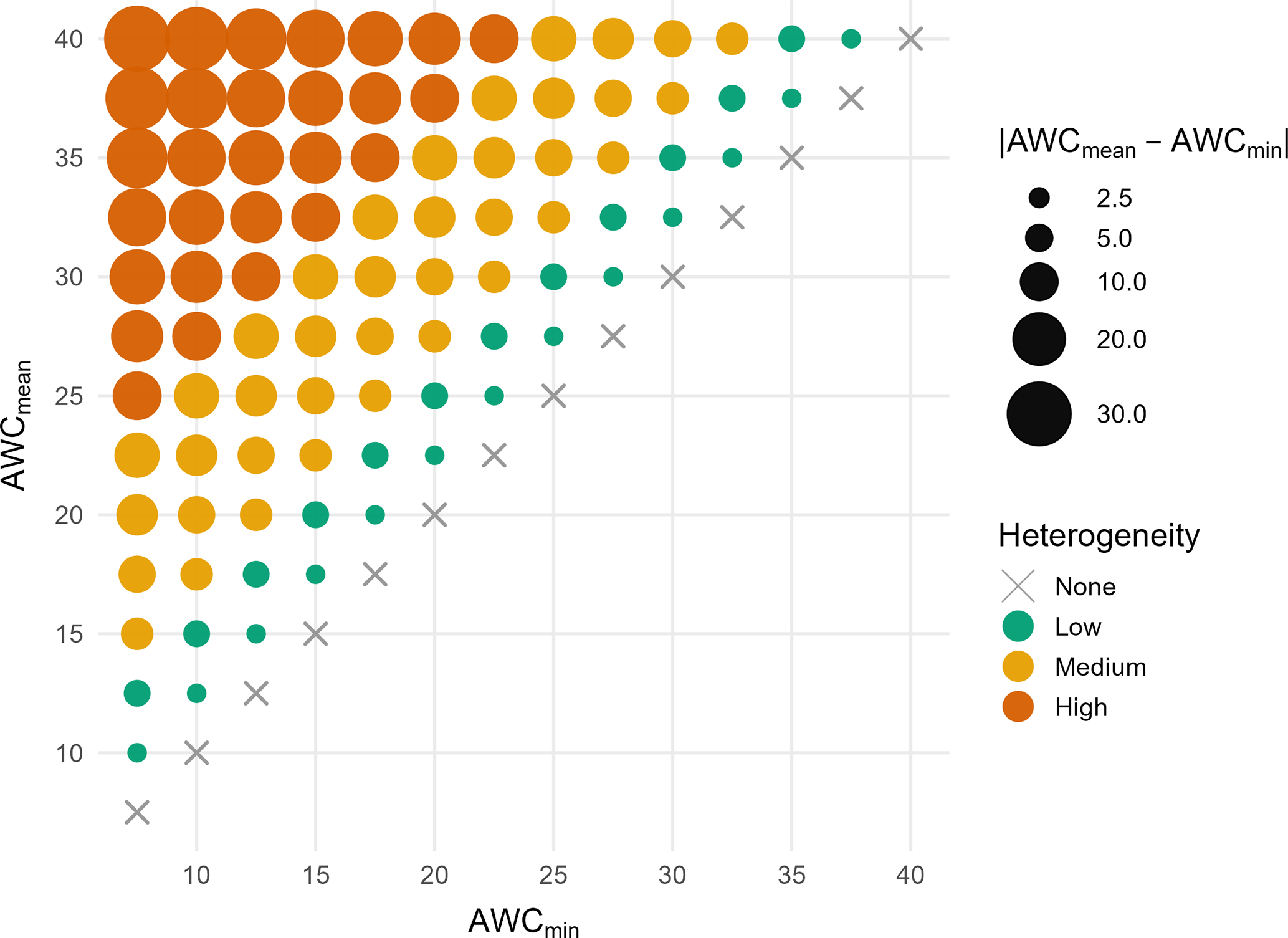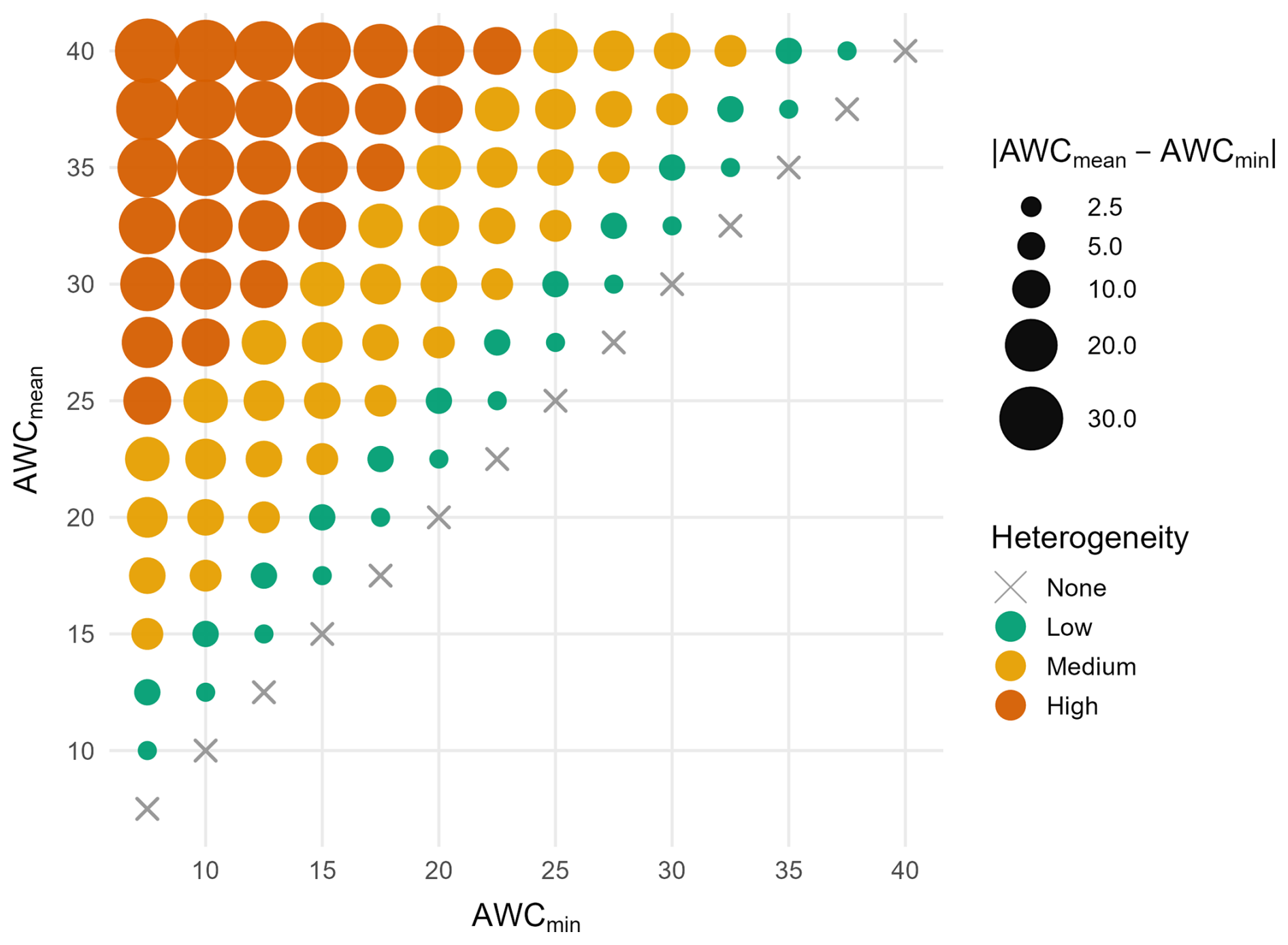 Figure 2Soil scenarios are defined as combinations of minimum and mean AWC. Distinct colors indicate soil heterogeneity classes, ranging from no heterogeneity (AWCmin=AWCmean, None), across low and medium to high heterogeneity classes.