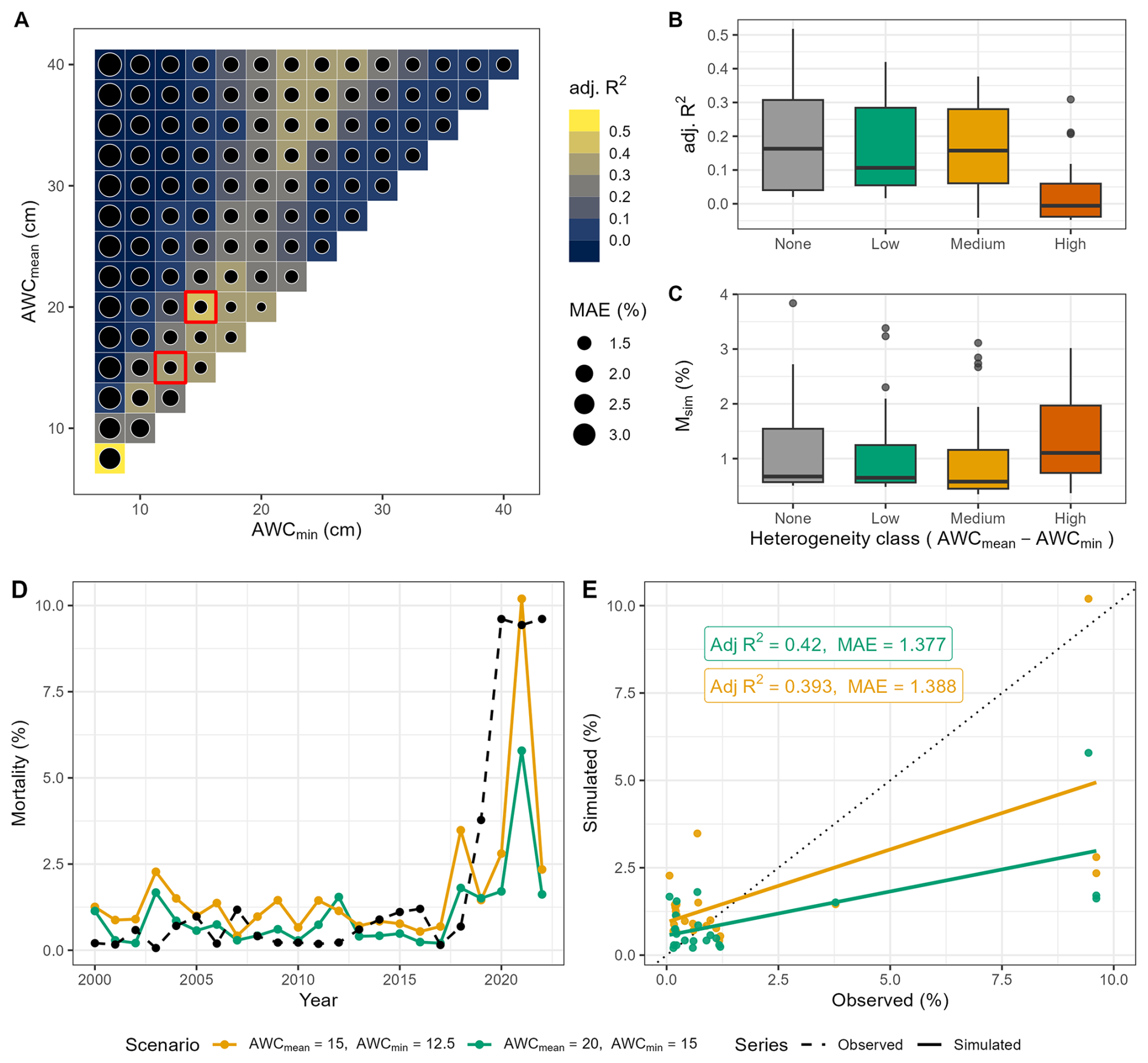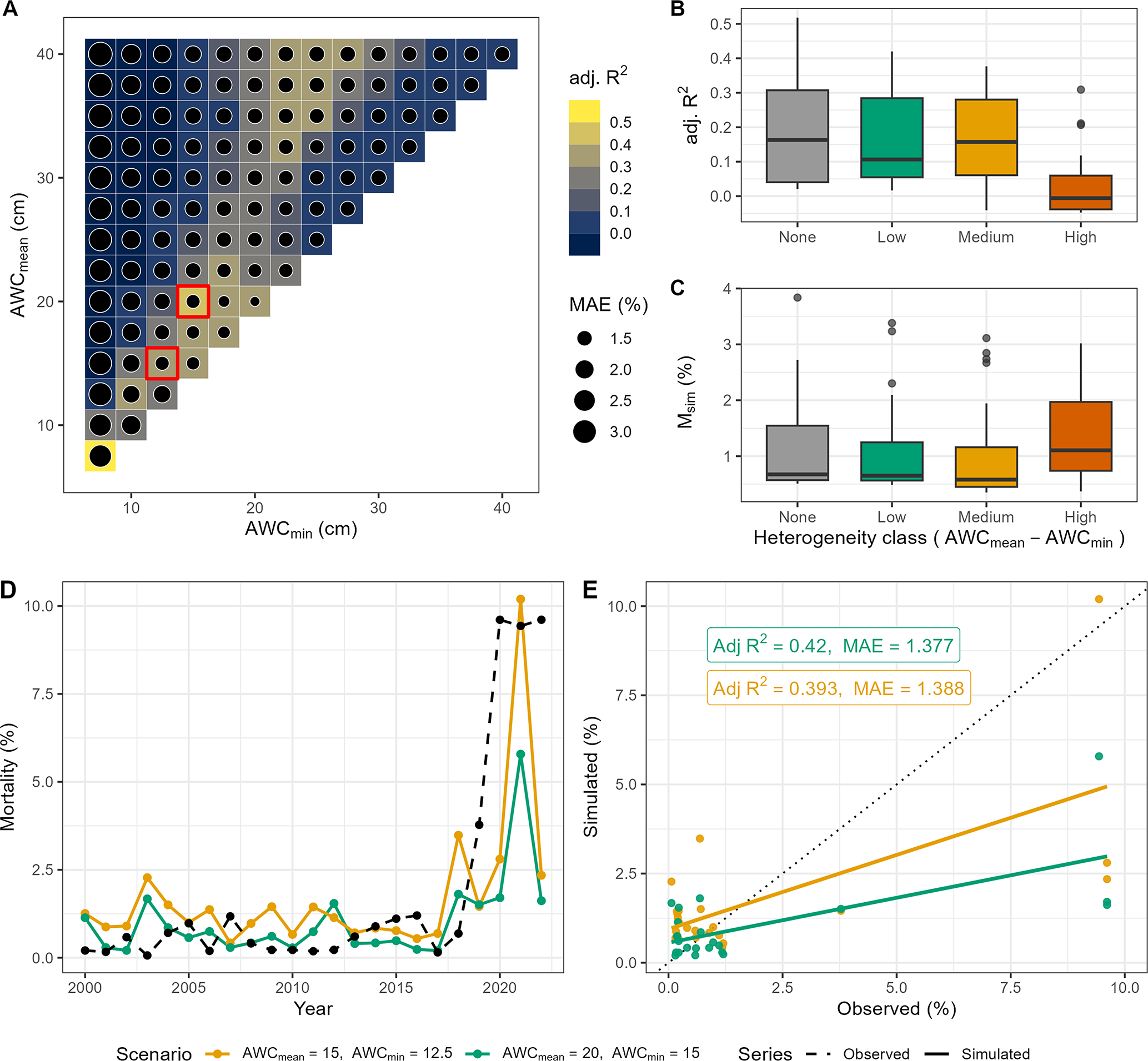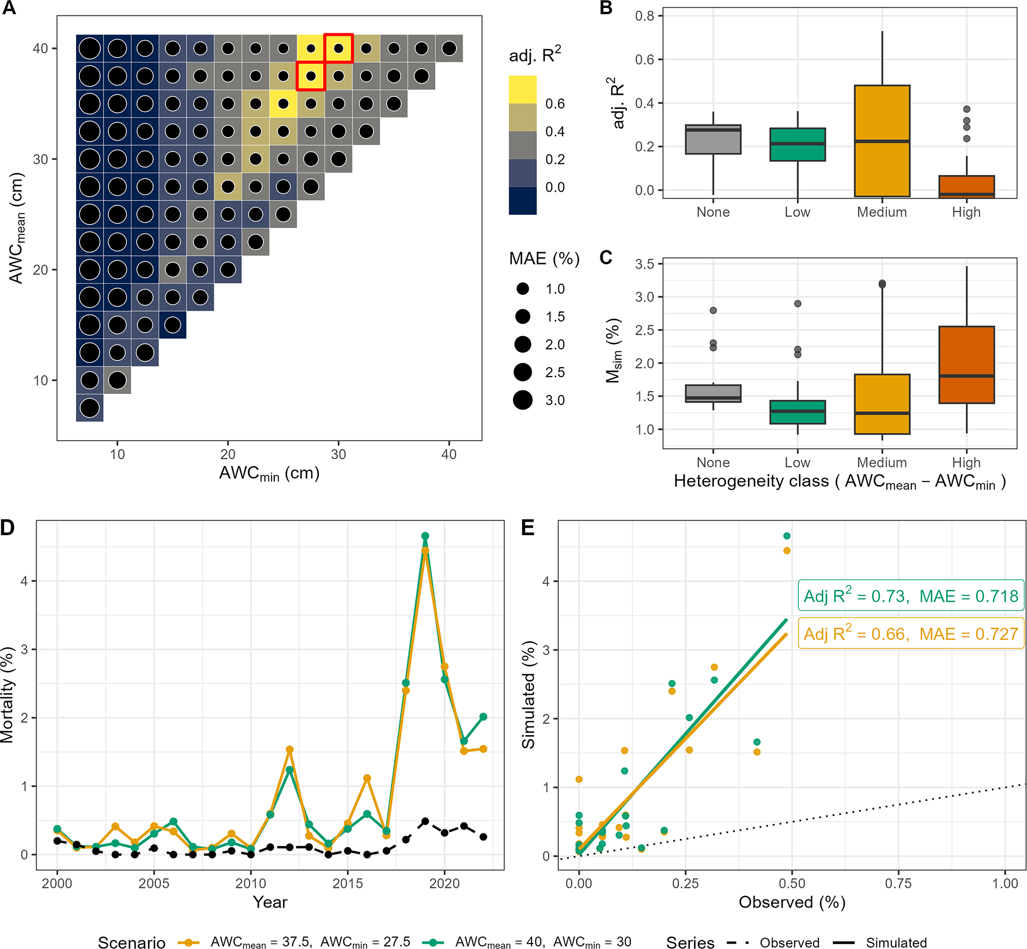 Figure 3Evaluation of the performance of soil moisture scenarios in reproducing simulated tree mortality compared to observed tree mortality for European beech-dominated sites. (A) AWC scenarios showing adjusted R2 and MAE. The two top-ranked AWC scenarios are indicated by red boxes. The top highest box (first row, starting from the top) represents scenario 95, while the second box (second row, starting from the top) indicates scenario 89. (B) Adjusted R2 and simulated mortality rate across heterogeneity classes (cf. Fig. 2). (C) Mean simulated mortality rate across heterogeneity classes. (D) Simulated (the two top-ranked AWC scenarios) and observed annual mortality rates over time across all sites, and (E) model statistics for the two top-ranked AWC scenarios. Scenario 89 is indicated in orange, while scenario 95 is in green.