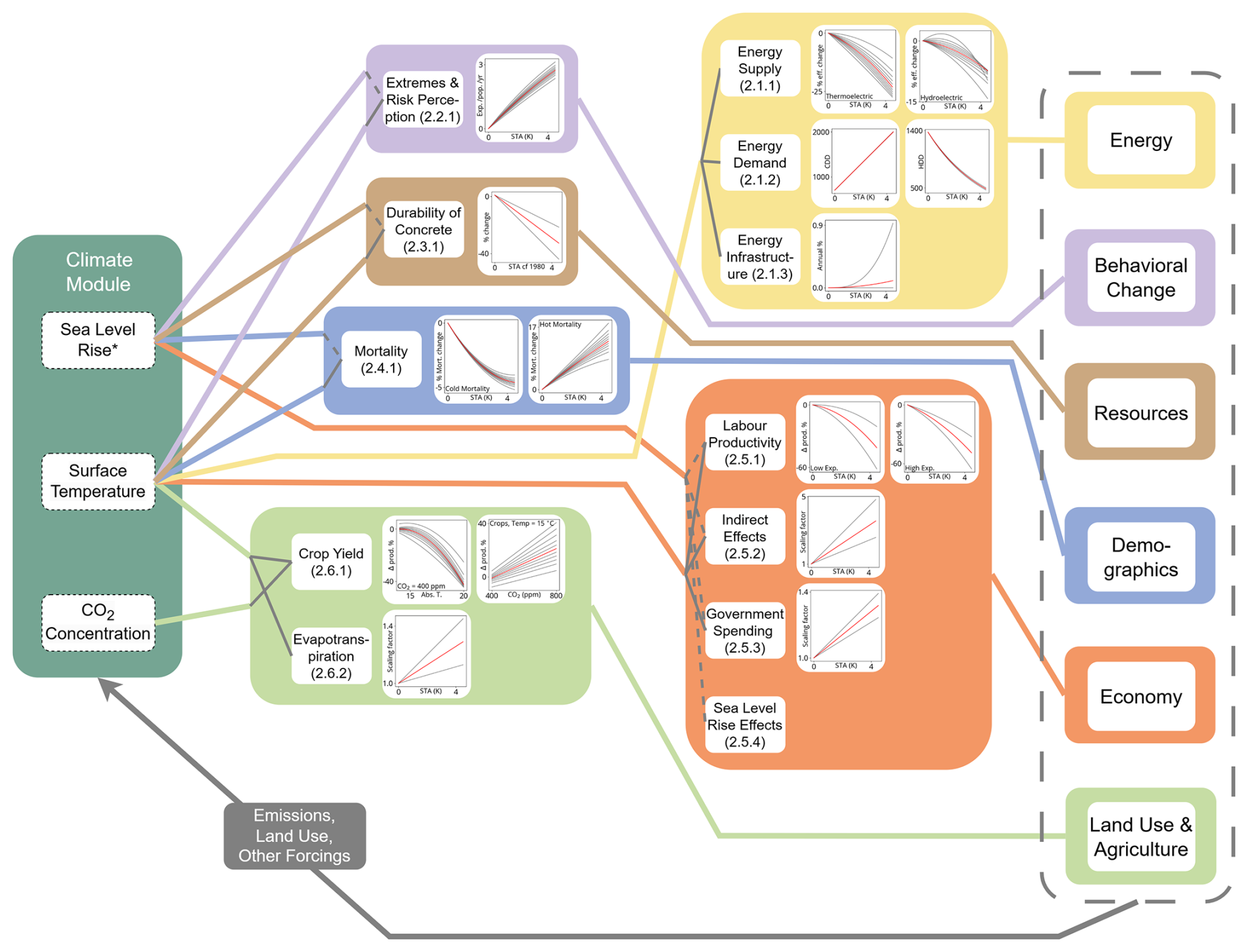 Figure 1Outputs from the Climate module (left), and their linkages to other modules in FRIDAv2.1 (right) via climate impact channels. Coloured lines and groupings indicate the module affected by each set of impacts; grey lines inside the central boxes show the specific drivers of each damage. Each numbered box represents a distinct climate impact channel, with its implementation process described in the corresponding part of Sect. 2. Graphs to the right of each channel name show the damage function(s) implemented as part of that impact channel; see Fig. A1 for a more detailed version of these graphs. Within the graphs, red curves represent the median central estimate, with grey giving the uncertainty variation. In cases in which uncertainty is treated by “Sampled Percentiles” in Table 1, the 11 parameter sets representing the 2.5th to 97.5th percentiles, with equal uncertainty spacing, are shown; for the other impact channels, the range using the upper and lower parameter values after literature analysis and internal calibration is shown. Completion of the human-Earth system feedback loops, via the cascading effect on human drivers of the Earth system response, is represented schematically by the grey arrow.  Sea Level Rise impacts are indicated in this figure, but generally cannot be reduced to a single function, and therefore are not represented in the plots. Instead these are discussed in their respective sections and Ramme et al. (2025).