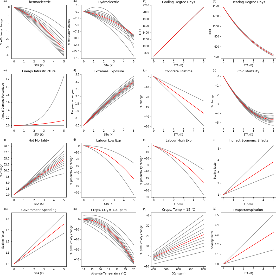 For implementation of this effect in FRIDA, the impacts on global thermoelectric production under both scenarios (RCP2.6 and RCP8.5) and decades (2020s and 2050s) studied by Van Vliet et al. (2016) were taken from their Table S5, and regressed against global mean temperatures using a quadratic fit with no intercept (see the Appendix Sect. A3 for details on data processing and the functional form).
