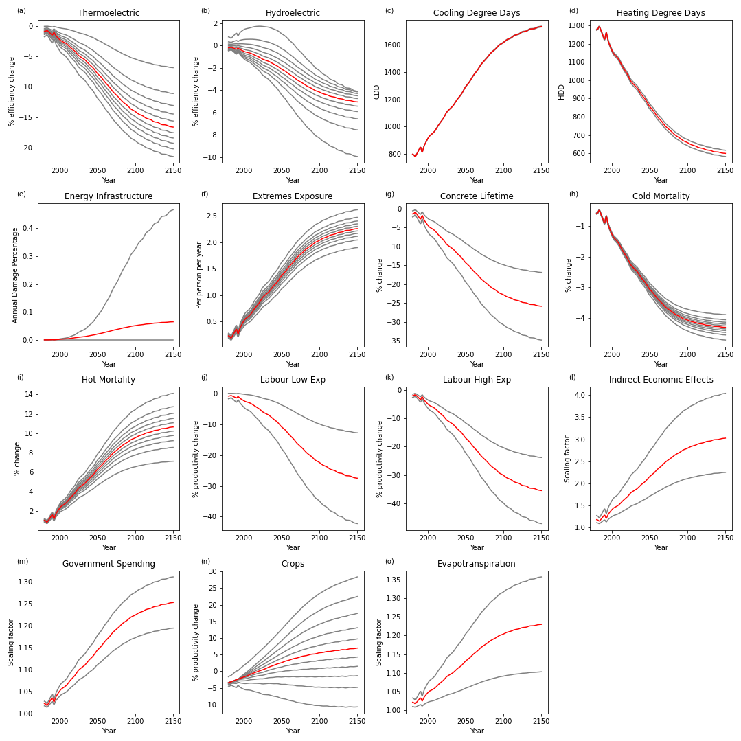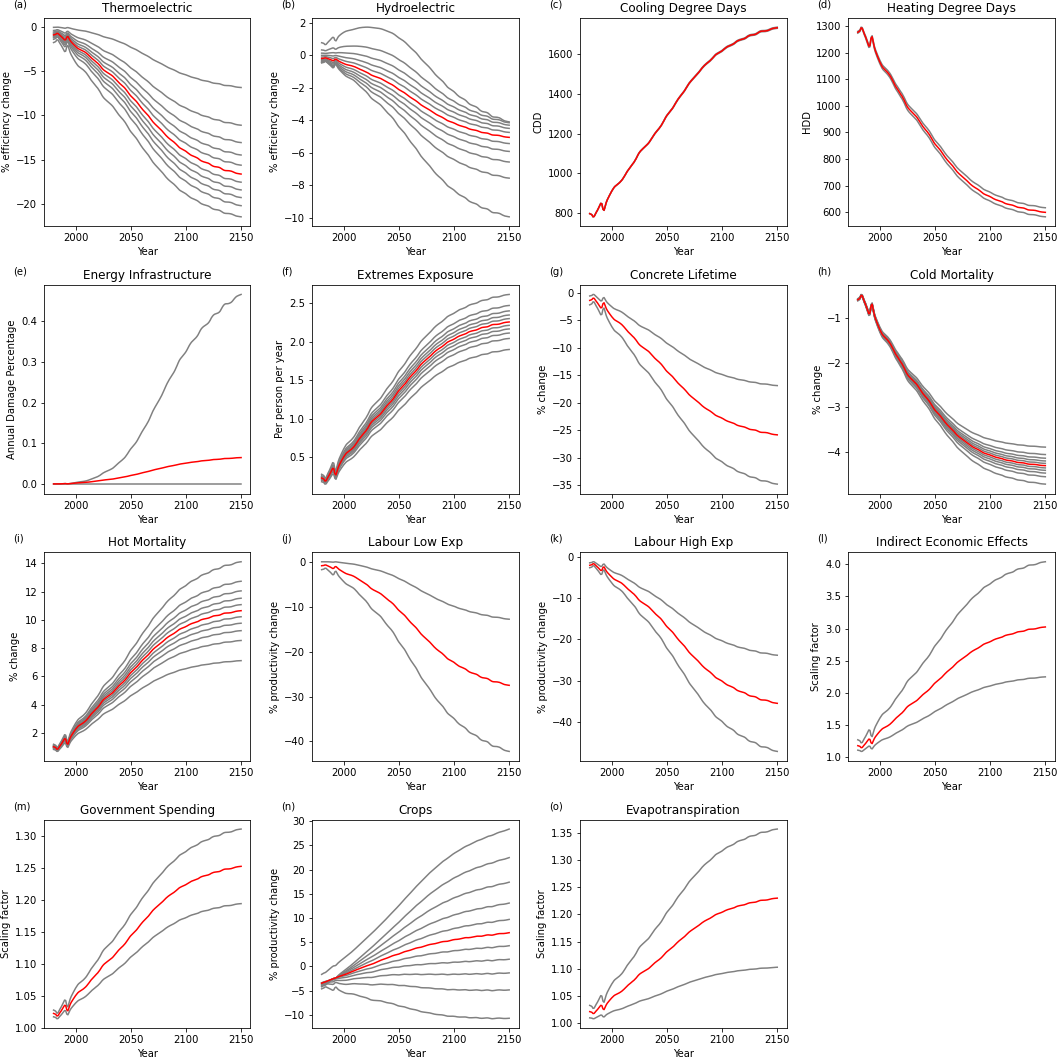 Many studies investigate the effect of climate changes on the energy supply of various sources (Yalew et al., 2020), but many focus on local responses, rather than larger-scale effects relevant to FRIDA. Additionally, many uncertainties persist on larger scales, with a literature review by Yalew et al. (2020) determining broad ranges in regional and global impacts for different sources of energy. This diversity is unsurprising, due to the range of potential impact channels and scenarios available to be studied. Based on existing literature estimates, in FRIDAv2.1 only climate impacts on thermoelectric and hydroelectric power generation are simulated.