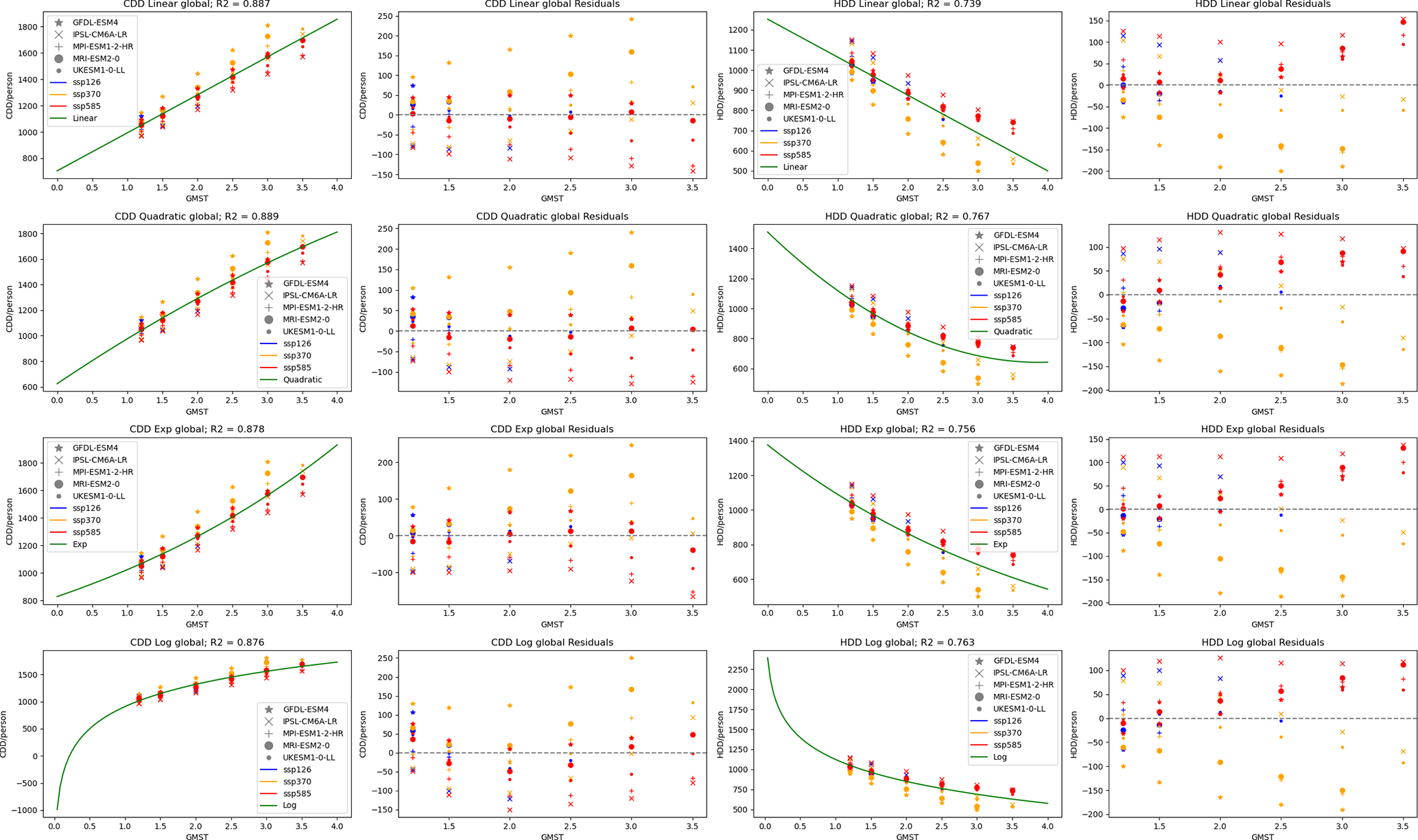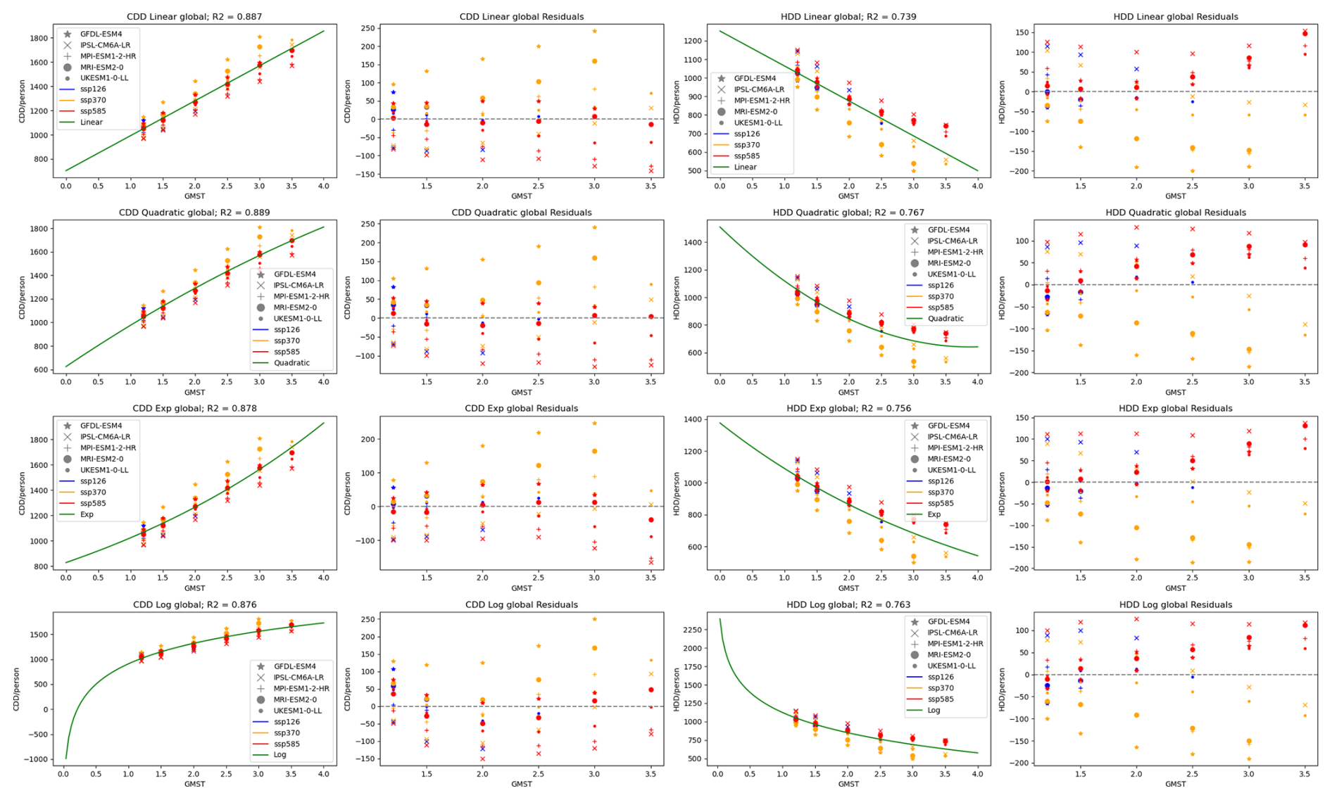 For FRIDA, population-weighted CDD and HDD are required, to capture the energy demand-driving component of change. Adapting the framework by Werning et al. (2024b), in FRIDA the response of global average annual CDD and HDD per person, using thresholds of 22 and 18 °C respectively, under a range of SSP projections of emissions and population, was calculated and modelled as a function of GMST.