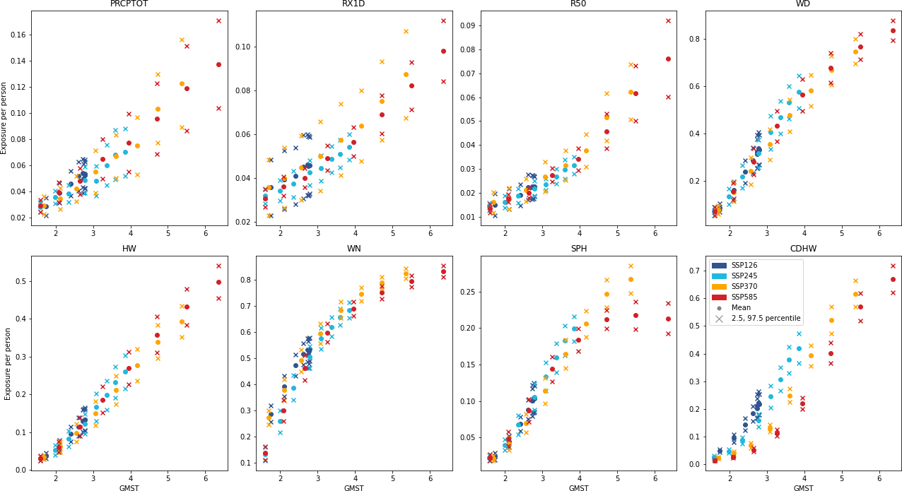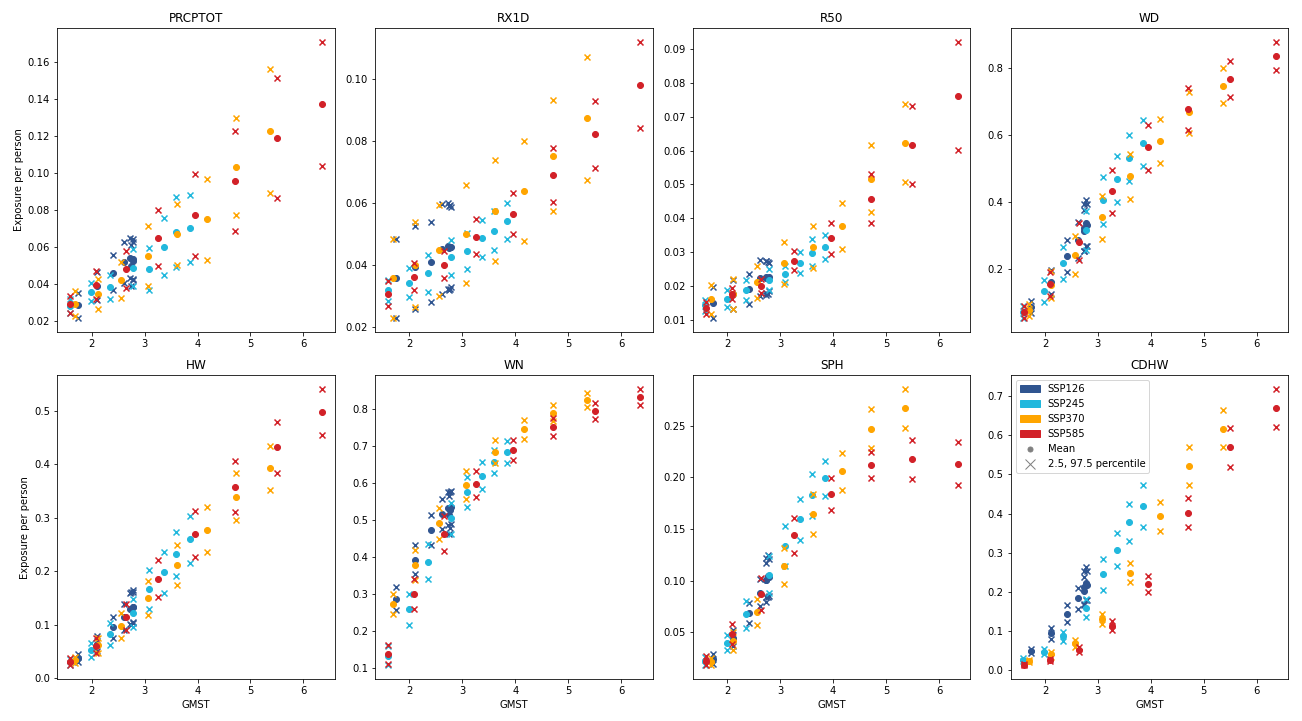 While Schwingshackl et al. (2021) have found a range of heat stress indicators to scale approximately linearly with GMST, with the gradient dependent on the chosen indicator, they only cover temperature (and humidity)-based metrics. Instead, Li et al. (2023) studied the change in population-scaled exceedances of historically-observed extremes in downscaled CMIP6 data from 35 models for the four “Tier 1” SSPs (SSP1-2.6, SSP2-4.5, SSP3-7.0 and SSP5-8.5), across a range of indices relating to temperature, precipitation, and compound events. A person was counted as exposed if they experienced an event more extreme than the historically-observed events for that gridcell. This was presented as decadal averages from the 2020s to the 2090s across a range of scenarios. For use in FRIDA, this was normalised by the global population, converting to the population-averaged response, and then summed over the seven available indices (Annual total precipitation, Maximum 1 d precipitation, Number of days with heavy precipitation, Warm days, Heatwave, Sequential precipitation-humid heatwave, and Compound drought and heatwave).