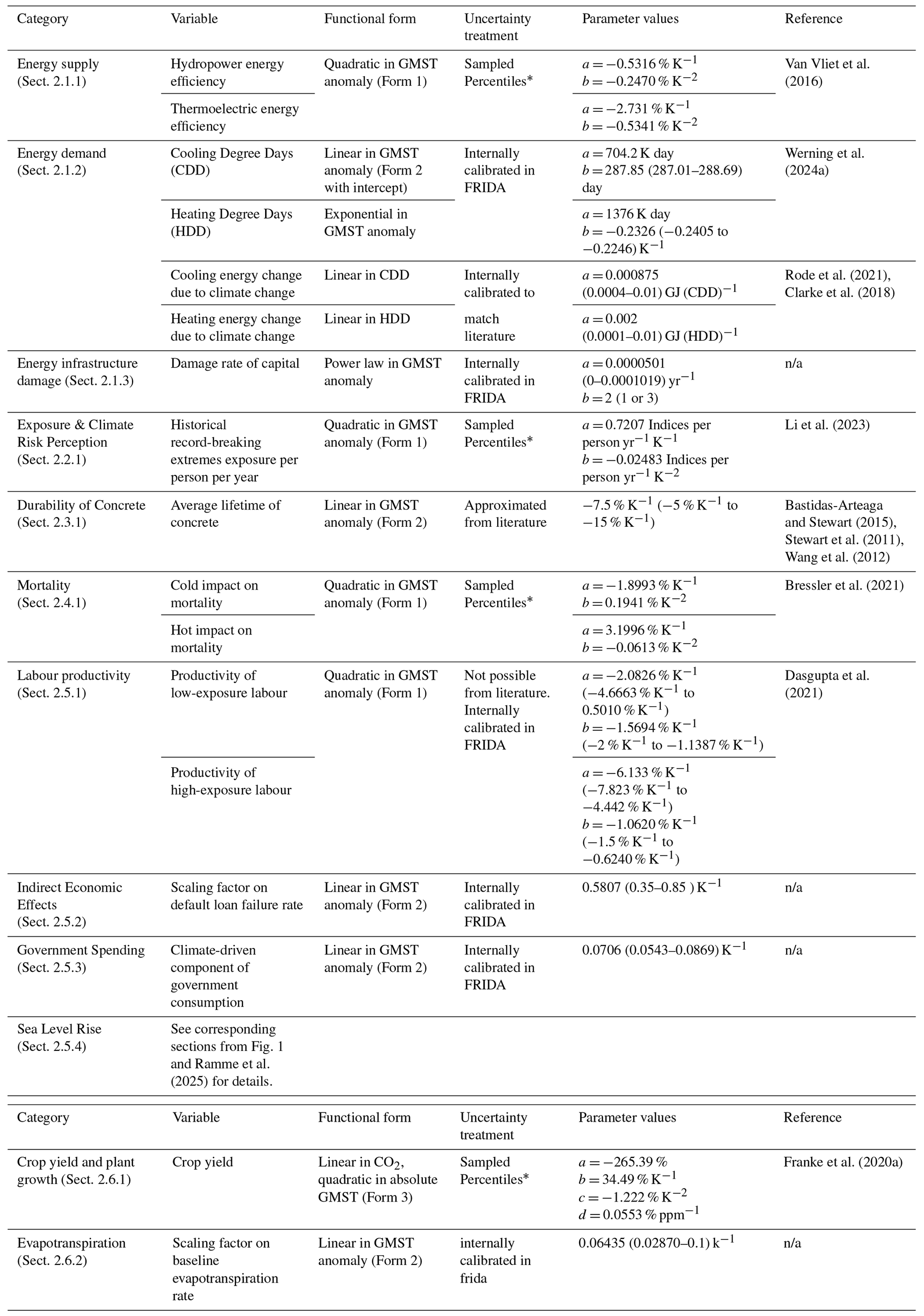 Where possible, data to generate impact functions were sourced from existing literature, either from modelling or empirical observation studies. However, for several impact channels deemed essential for inclusion in FRIDA due to their assessed importance in order to aid internal consistency, appropriate literature could not be identified. These channels were therefore incorporated using expert-supplied functional forms that were dimensionally consistent, with the extreme condition response validated. Parameter values for these functions were calibrated internally using the method described in Schoenberg et al. (2025a). Under uncertainty analysis in FRIDAv2.1, uniform samples are drawn from the specified parameter ranges (Table 1) for these channels.