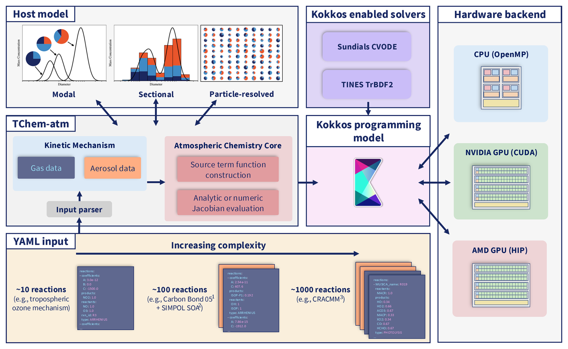 We begin with an overview of the software architecture and the relationship between TChem, CAMP, and TChem-atm (Sect. 2.1), since these design choices define the core abstractions used throughout the implementation. The workflow then begins with user-defined YAML input files that specify gas-phase chemical mechanisms and aerosol processes (Sect. 2.2). These inputs are parsed into structured data objects for the gas and aerosol phases (Sect. 2.3), which are synchronized to device memory via dual Kokkos views. TChem-atm then constructs source terms for gas-phase chemistry (Sect. 2.5) and for aerosol-phase processes using a flexible abstraction that supports sectional and particle-resolved representations (Sect. 2.7 and 2.6). Performance portability is achieved through the Kokkos programming model (Sect. 2.8), which enables execution on CPUs as well as NVIDIA and AMD GPUs. If needed, Jacobian matrices are computed (Sect. 2.9) and passed to one of several supported ODE solvers (Sect. 2.10). Our testing approach is described in Sect. 2.11. Finally, we describe the integration of TChem-atm with PartMC, which enables particle-resolved aerosol simulations using batched, scalable multiphase chemistry (Sect. 2.12). The following subsections provide implementation details for each component of the implementation.