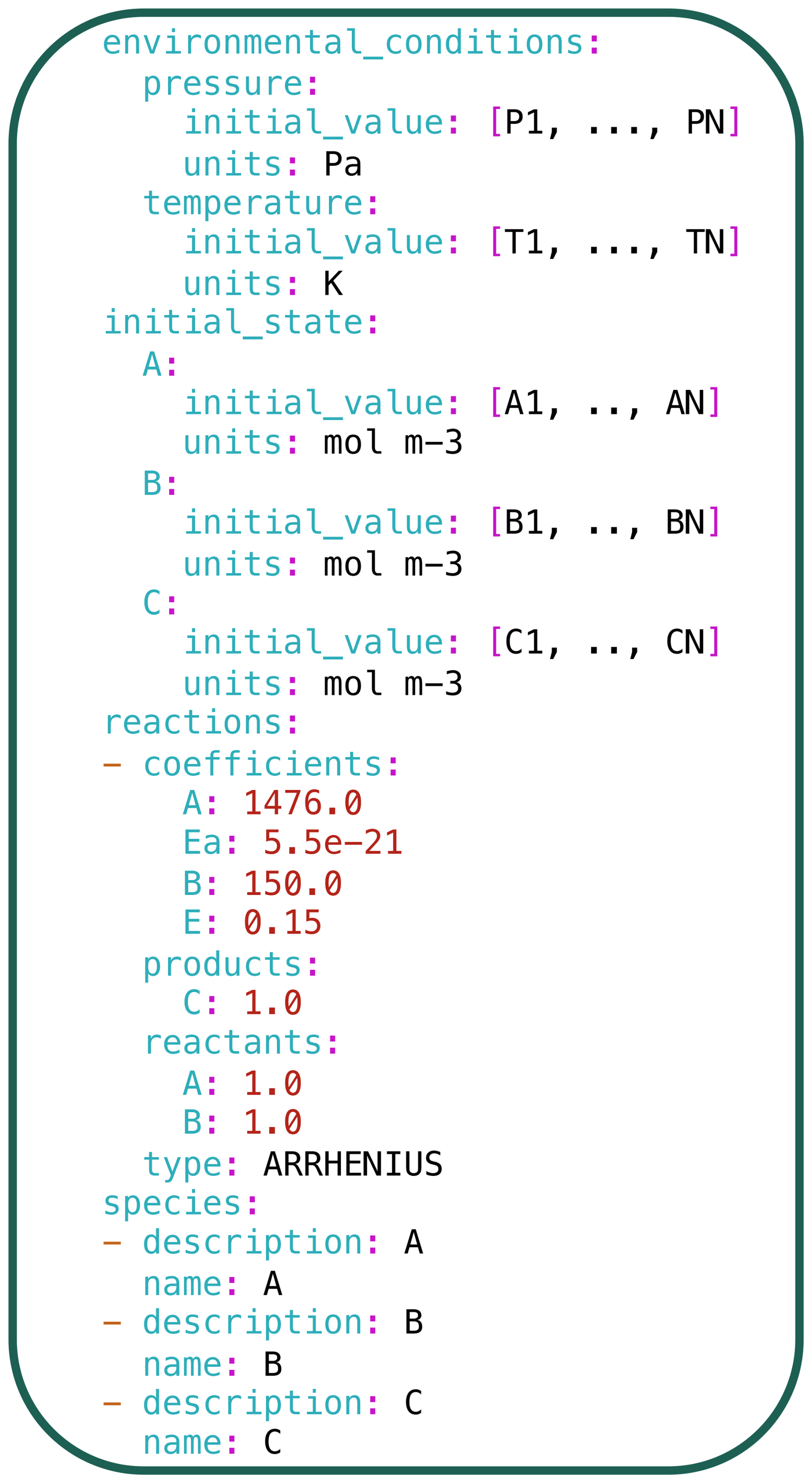 Figure 2Example YAML input specifying a simple gas-phase mechanism consisting of a single reaction with three species (A+BC) used in simulations with N independent computational cells, each solving a separate instance of the ODE system.