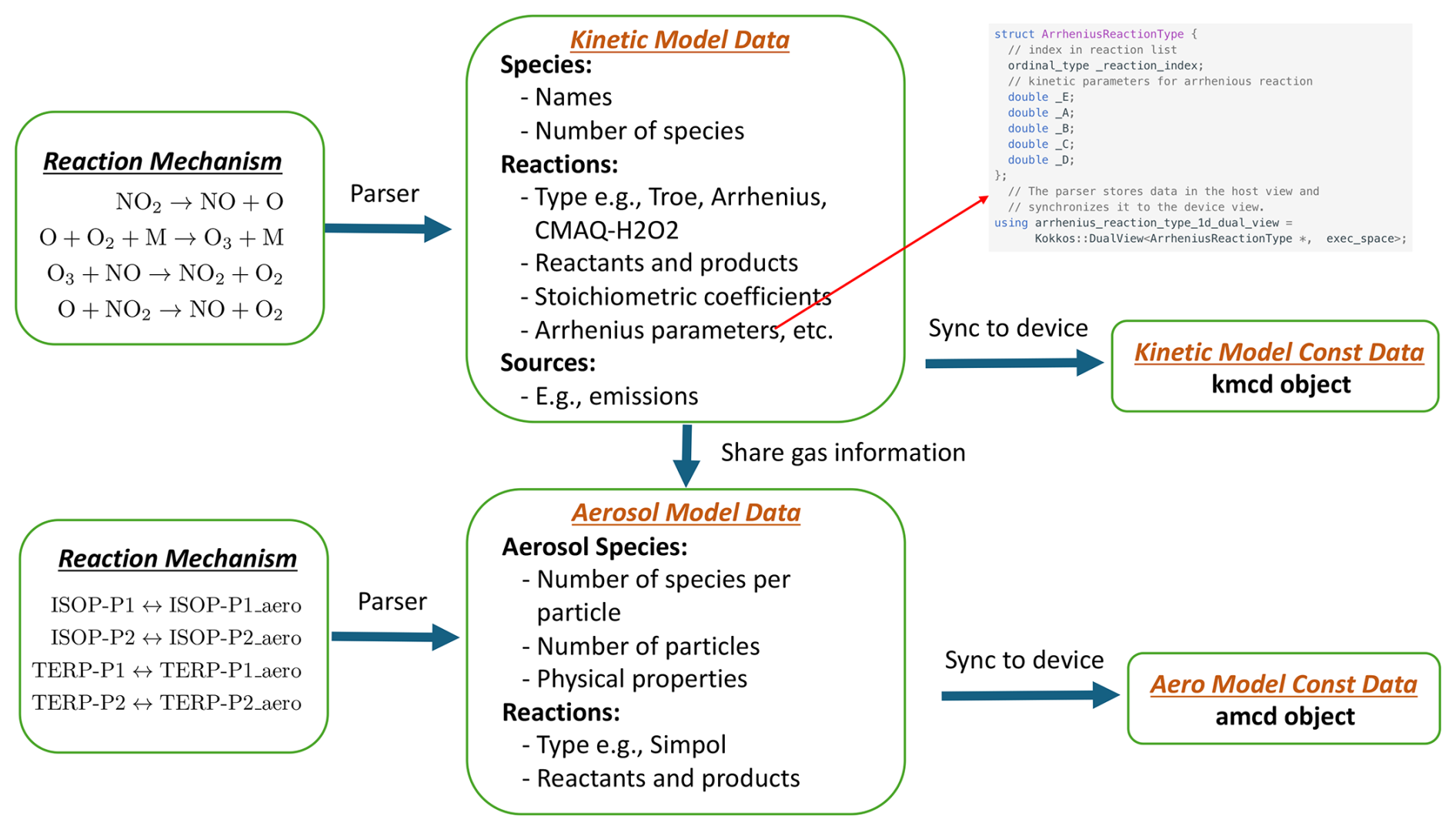 Constructing these data objects involves two steps. First, the reaction mechanism is parsed and the relevant kinetic or thermodynamic information is stored in intermediate Kinetic Model and Aerosol Model data objects. These data are stored in dual Kokkos views, which allow synchronization of data between host and device memory. The data are further categorized and organized to optimize device-side kernel computation and facilitate postprocessing. For instance, for reactions following the Arrhenius form, TChem-atm stores both the reaction type and the associated parameters in separate dual views, as presented in Fig. 3.