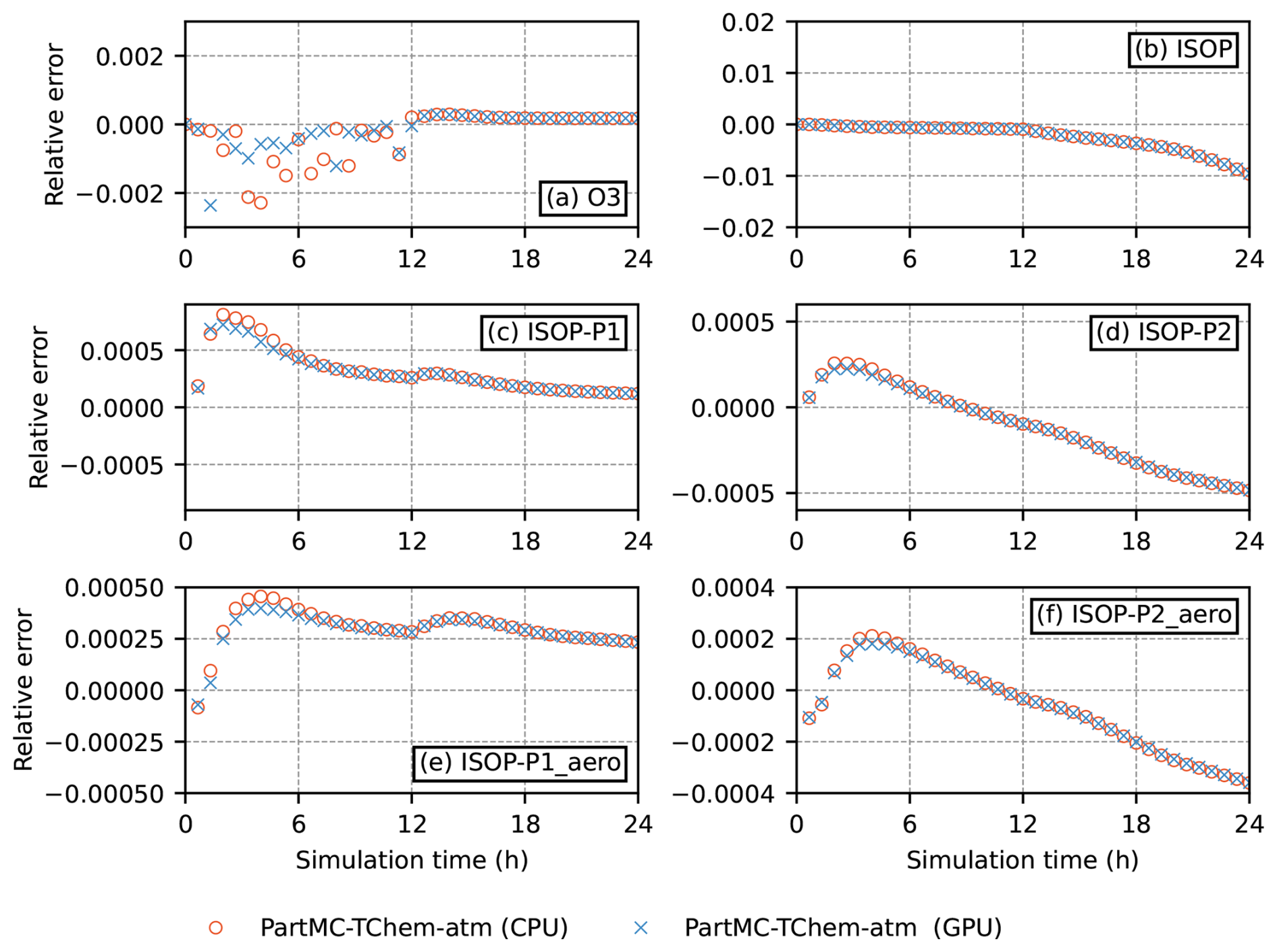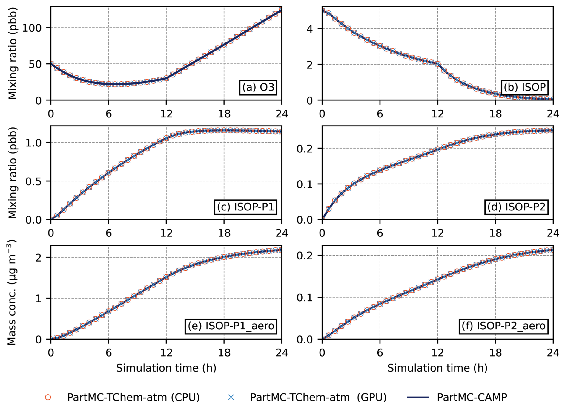 Simulation results are shown in Fig. 5. Panel (a) displays the 24 h time series of ozone mixing ratios as predicted by PartMC-CAMP, PartMC-TChem-atm (CPU), and PartMC-TChem-atm (GPU). Panels (b)–(d) shows the evolution of gas-phase isoprene (ISOP) and its semi-volatile products, ISOP-P1 and ISOP-P2. ISOP-P1 is formed through the reaction of ISOP with OH, while ISOP-P2 results from its reaction with ozone. Figure 5e–f presents the aerosol-phase mass concentrations of ISOP-P1_aero and ISOP-P2_aero, which arise from the partitioning of their respective gas-phase precursors.