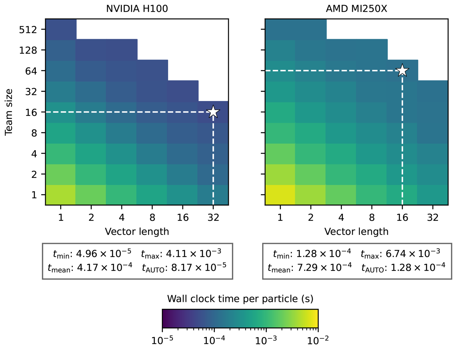 Figure 8Heatmaps of wall clock time per particle as a function of Kokkos team size and vector length for the SUNDIALS CVODE-GMRES solver on the NVIDIA H100 (left) and AMD MI250X (right). For each solver run, the number of particles was fixed at 1000. The optimal configuration (lowest wall clock time) is indicated by a white star in each plot.