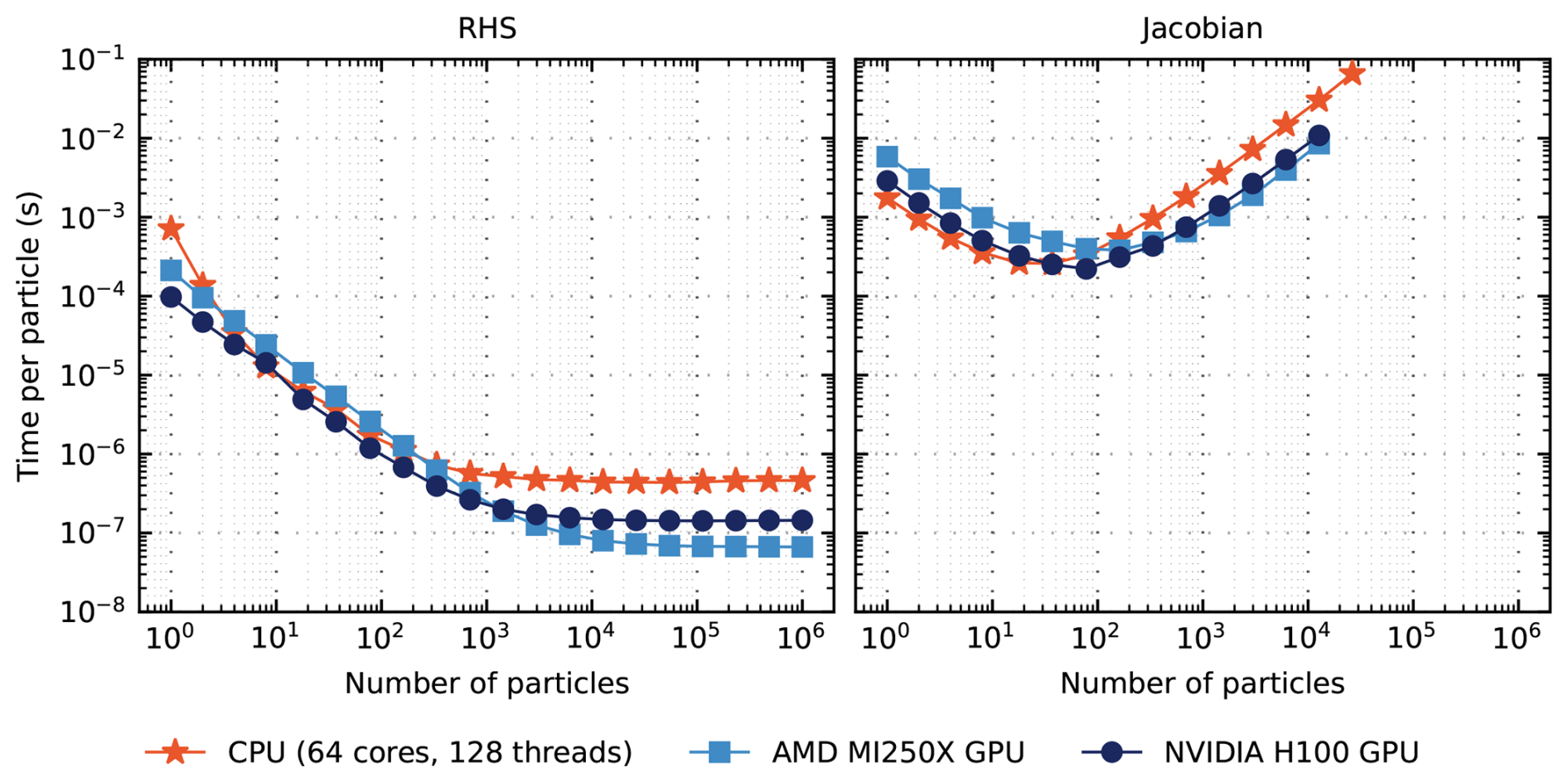 In contrast, SUNDIALS CVODE-GMRES employs a Jacobian-free Krylov method, which avoids explicit construction of the Jacobian. This enables continued scaling to larger particle numbers, with wall clock time per particle decreasing even up to Np=106 on GPU architectures. These results underscore the importance of matching solver structure to problem size and hardware – dense solvers excel at small scale, while Jacobian-free methods offer superior scalability.