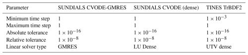 We evaluate the computational performance of TChem-atm on several hardware backends including multicore CPUs and both NVIDIA and AMD GPU architectures. To achieve this, the box model example from Sect. 3.1 was run by varying the number of computational particles, which increases the size of the source term and the Jacobian matrix. We tested several ODE solver configurations presented in Table 3, including TINES TrBDF2 and two variants of SUNDIALS CVODE that differ by the sparsity of the linear solver (SUNDIALS CVODE-GMRES and SUNDIALS CVODE (dense)). The same numerical parameters are applied for the three configurations.