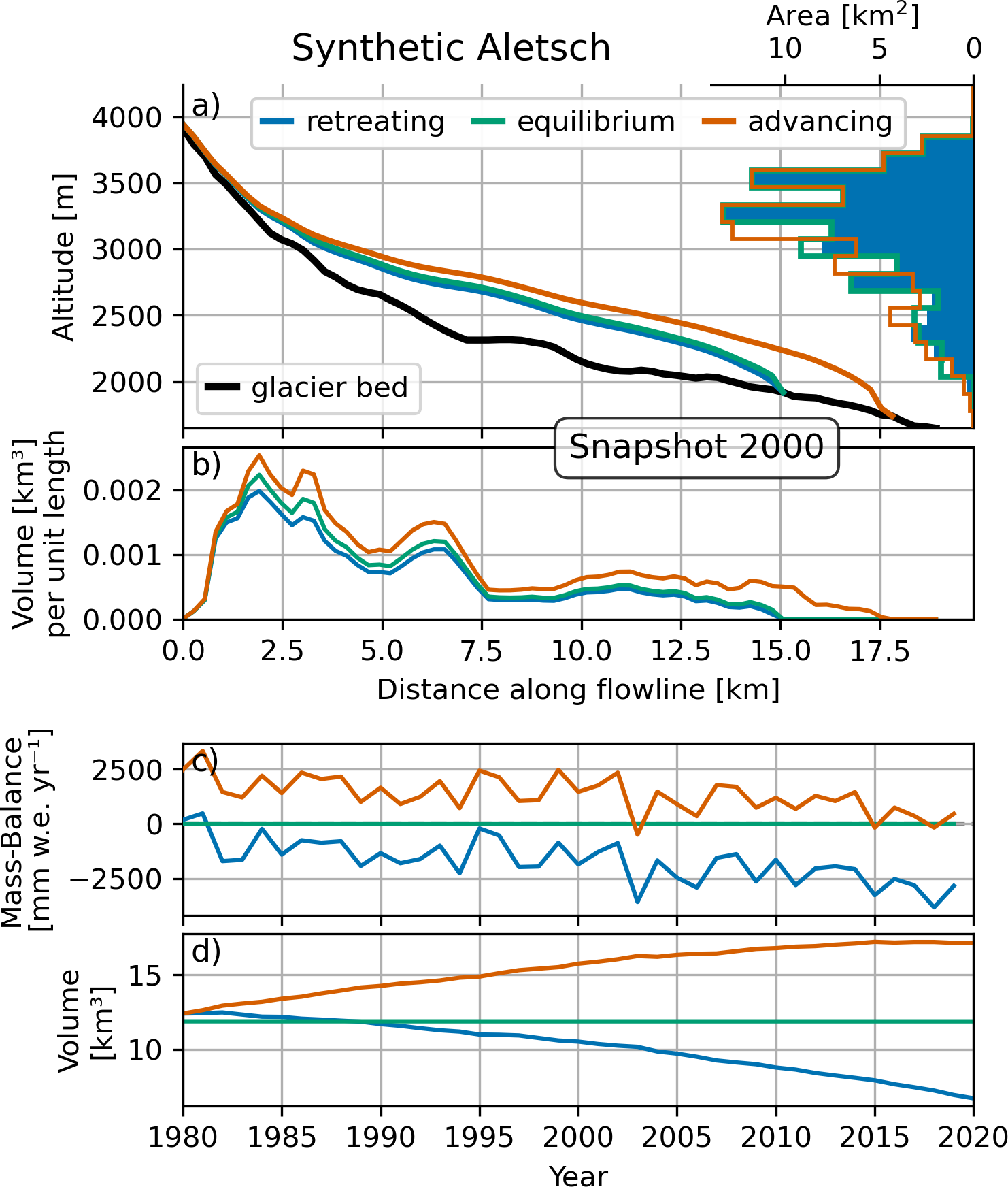 Figure 2Synthetic glacier geometry inspired by Aletsch, shown for retreating, equilibrium, and advancing glacier states. Panel (a) displays the defined glacier bed, ice thickness along the flowline, and area-height distribution for the year 2000. Panel (b) presents the volume distribution along the flowline for the year 2000. Panel (c) illustrates the driving mass balance used during the simulation from 1980 to 2020, and panel (d) shows the corresponding total glacier volume over the same period.
