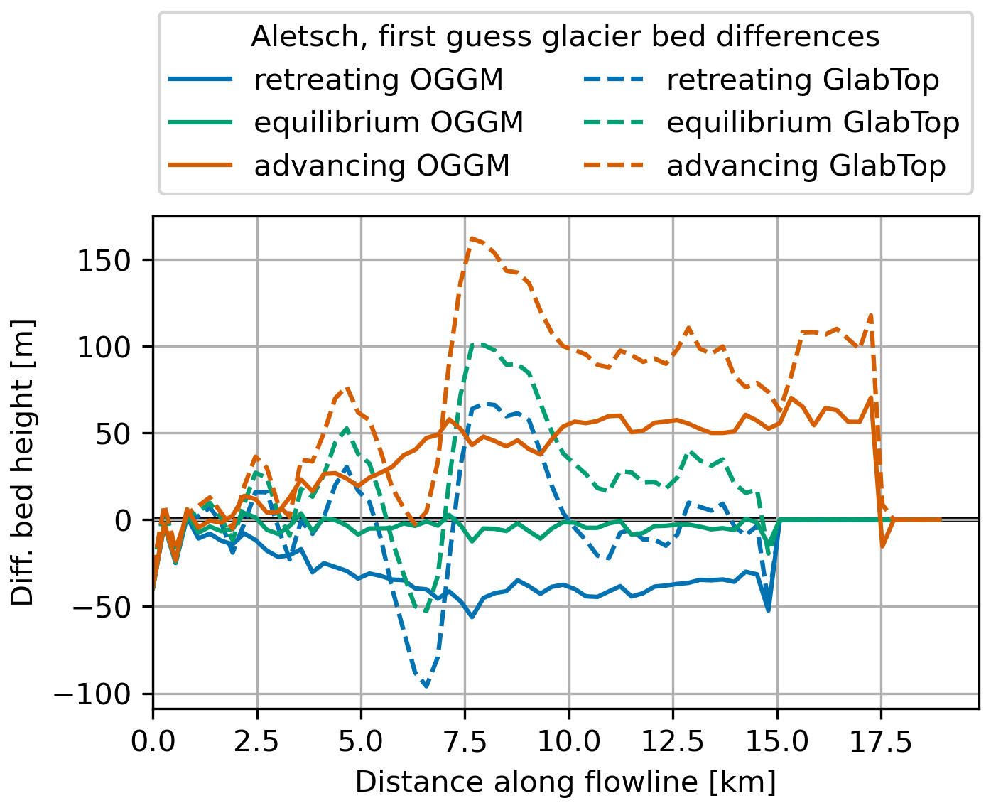 In contrast, the first guess glacier bed of the GlabTop method shows similar behavior across all dynamic states, as it relies solely on surface geometry and does not incorporate any mass balance forcing. The maximum absolute differences for Aletsch in Fig. 3 are 96.0 m (retreating), 100.9 m (equilibrium), and 162.2 m (advancing). This behavior is consistent across all tested geometries.