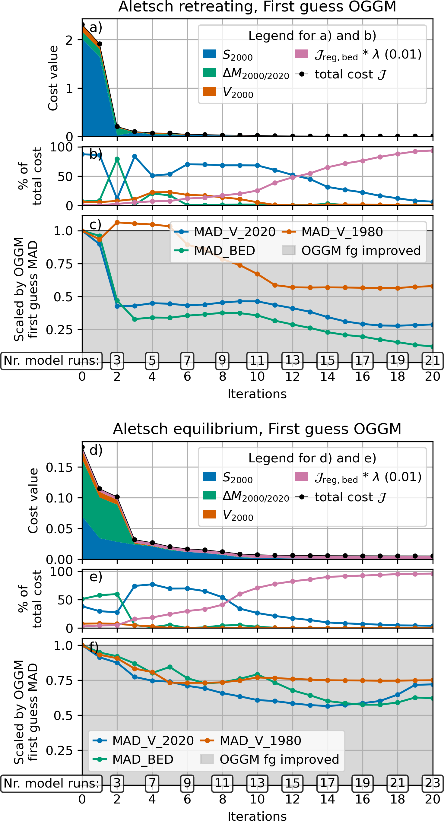 As an example of typical behavior in the equilibrium case, Fig. 4 panels d to f show the results for the Aletsch geometry starting from the OGGM first guess. The strong performance of the OGGM first guess is evident in the low initial total cost of just 0.18 (panel d), indicating that mismatches for all observations fall within their defined uncertainty ranges, suggesting that further optimization is not strictly necessary. Nonetheless, AGILE is able to refine the solution and improve upon this already strong first guess, as shown by the decreasing values of the performance metrics in panel f.