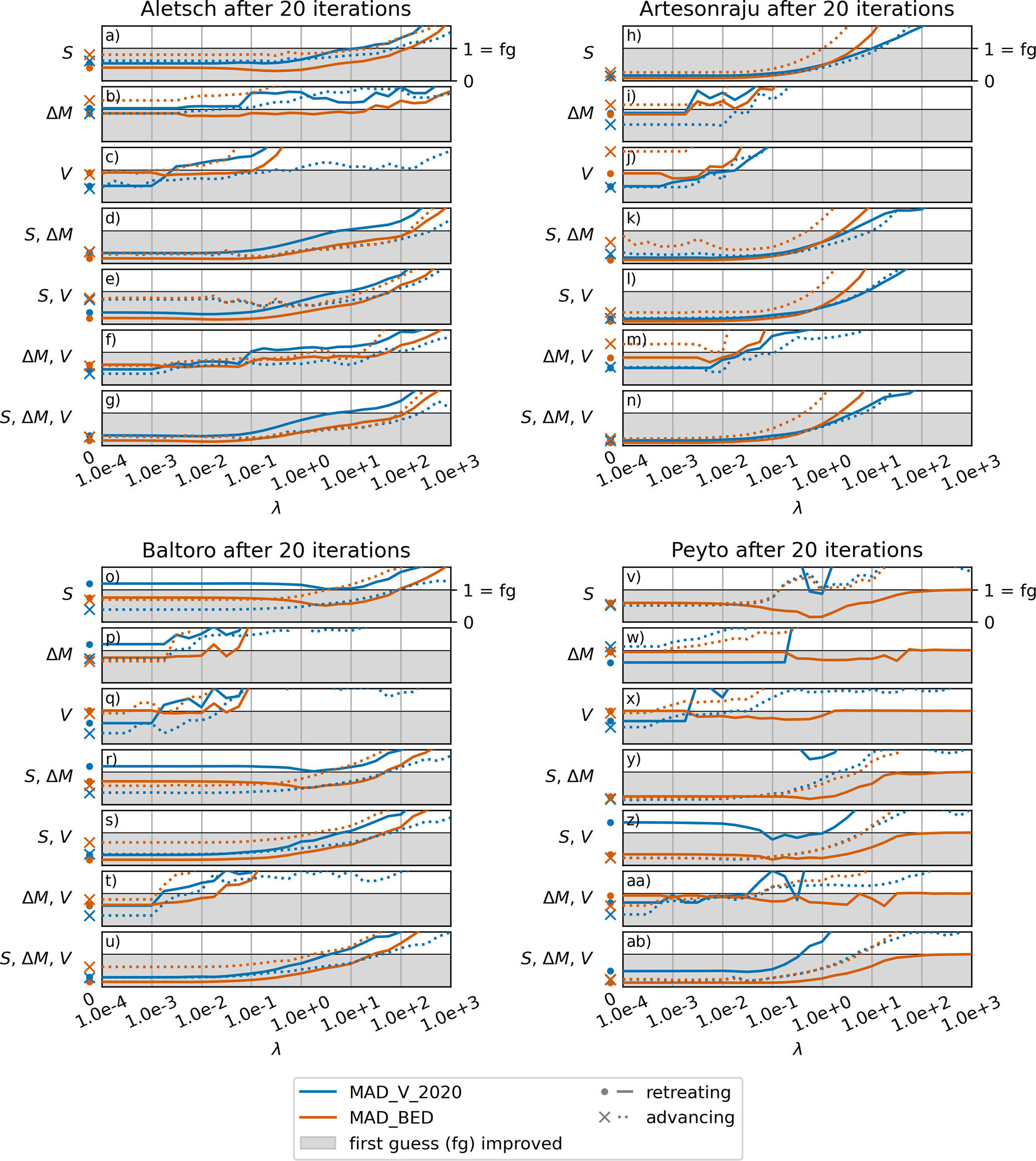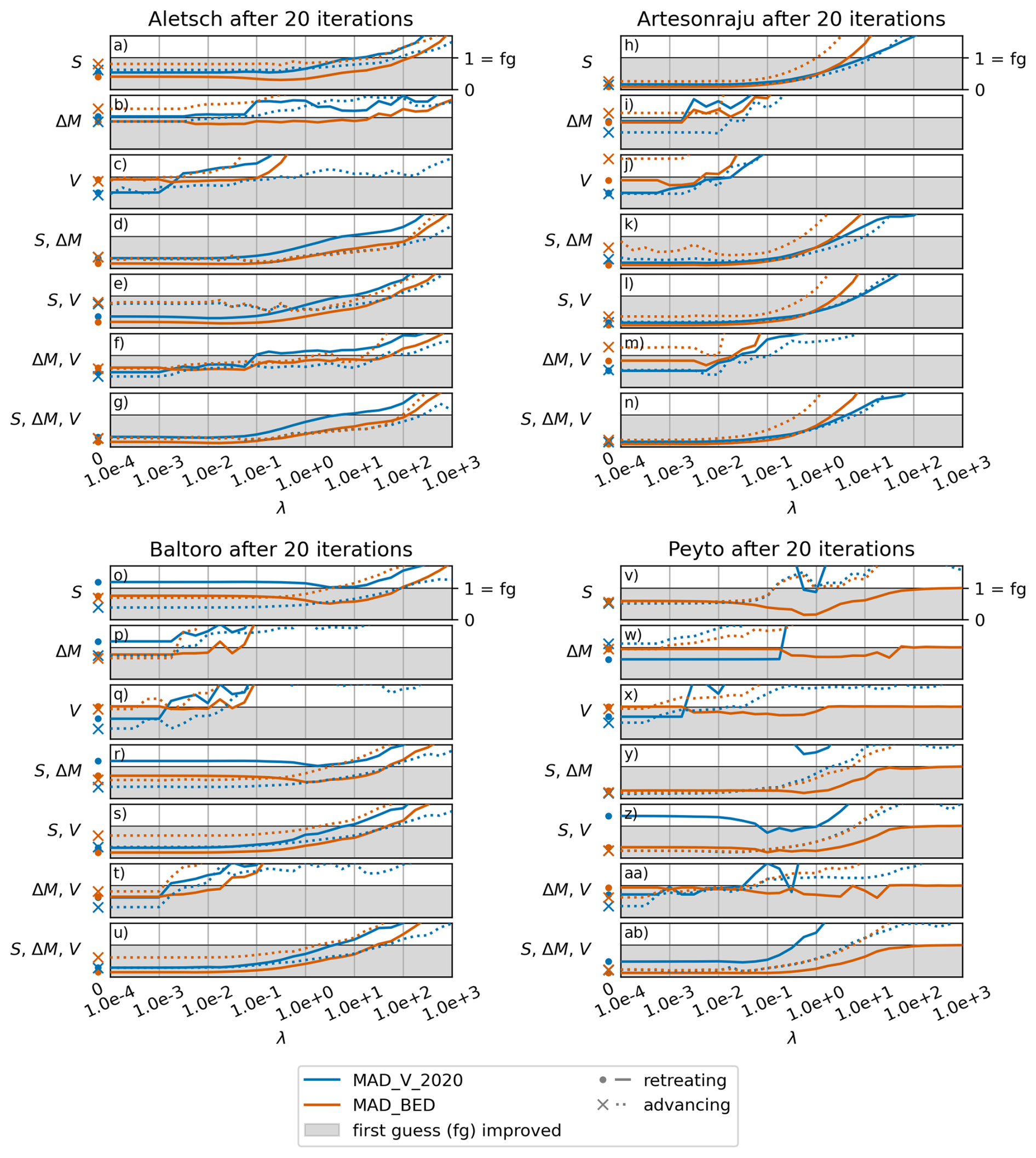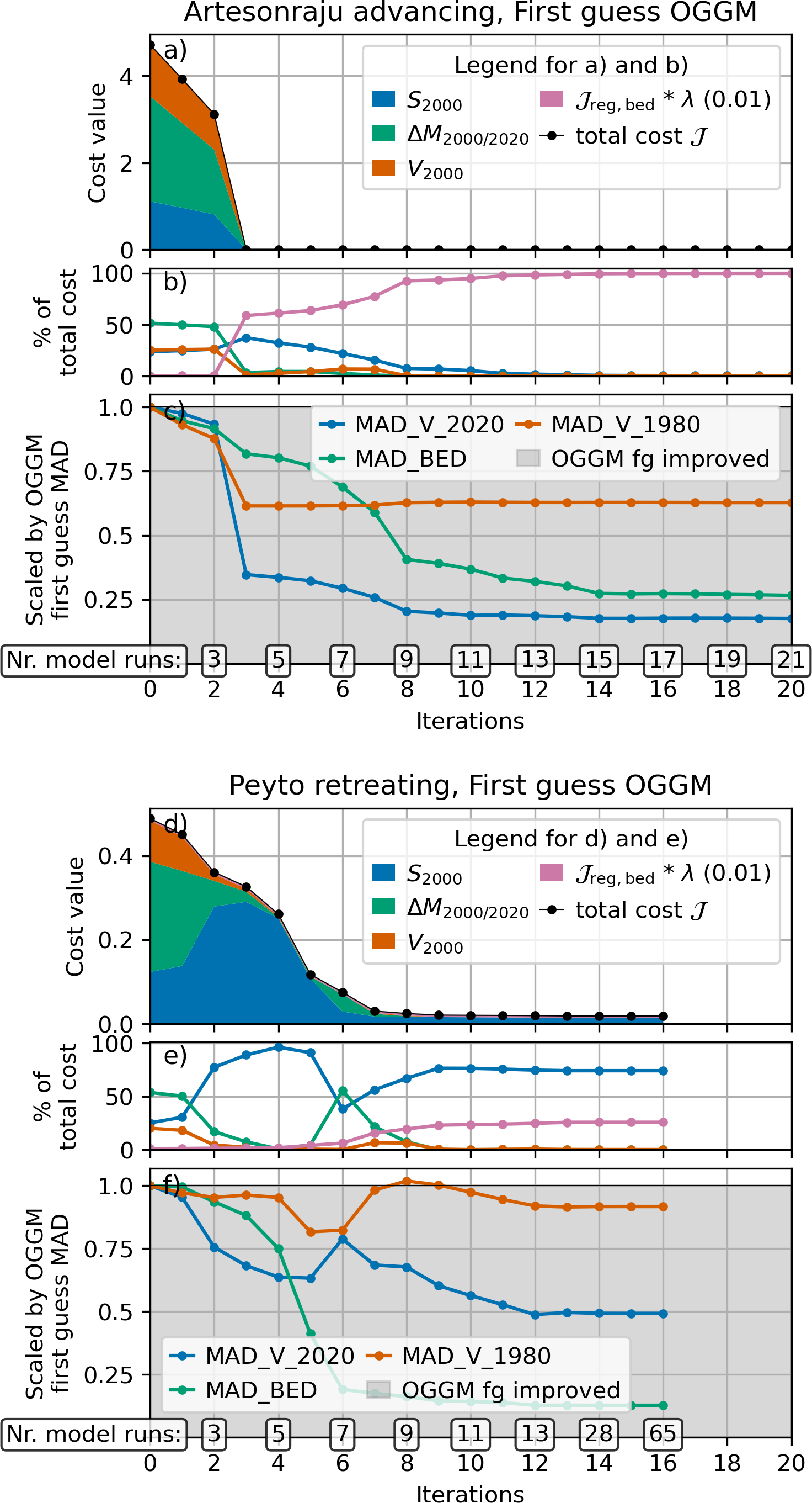 Analyzing the performance metrics (MAD_BED, MAD_V_1980, and MAD_V_2020) over iterations (Fig. 4, panel c) confirms that reductions in the cost function led to improved agreement with the synthetic truth. Significant improvements were observed for both the bed height and the distributed volume in 2020 compared to the first guess. While the distributed volume for 1980 initially worsened during the early iterations, it began improving relative to the first guess after the sixth iteration.