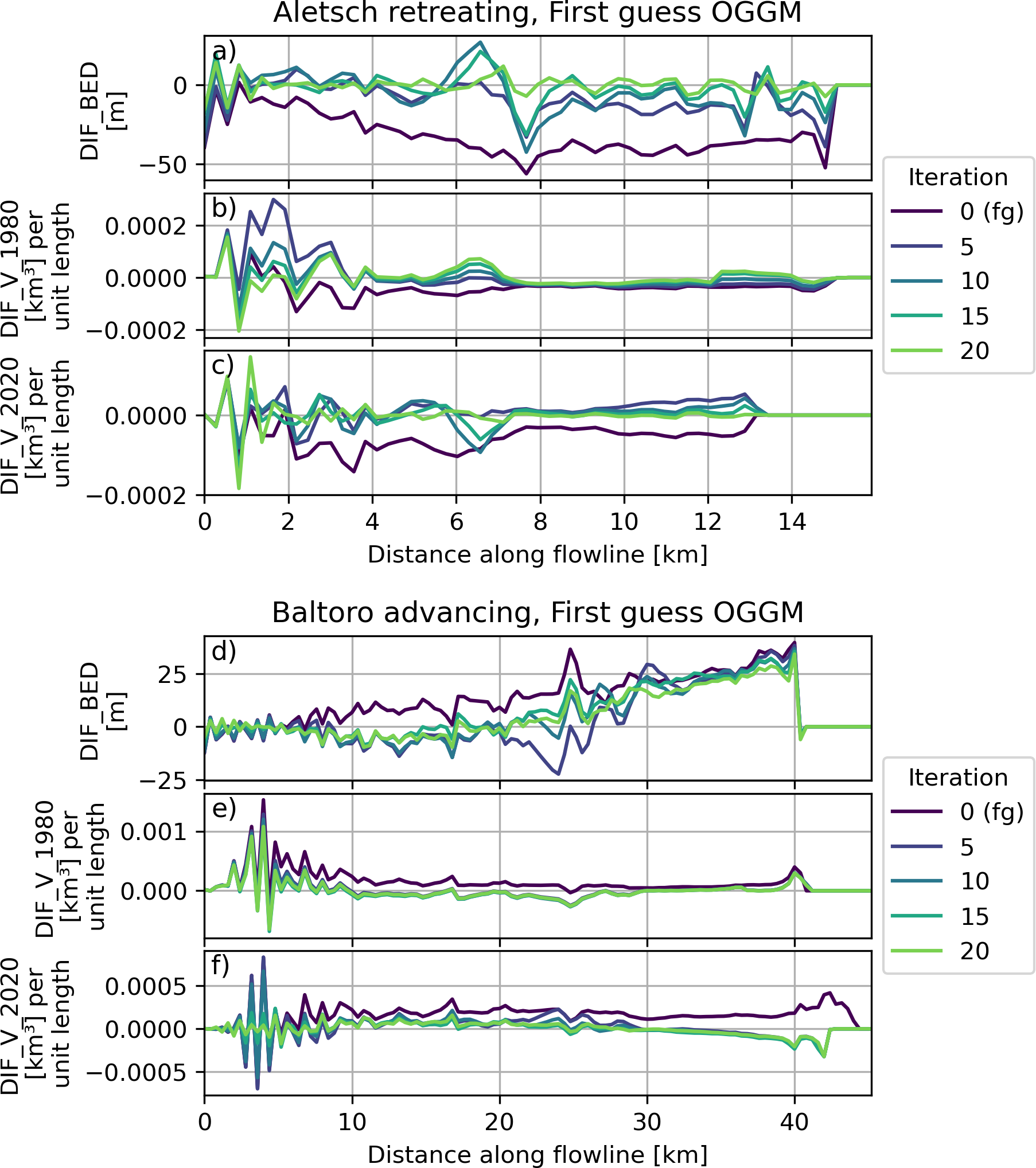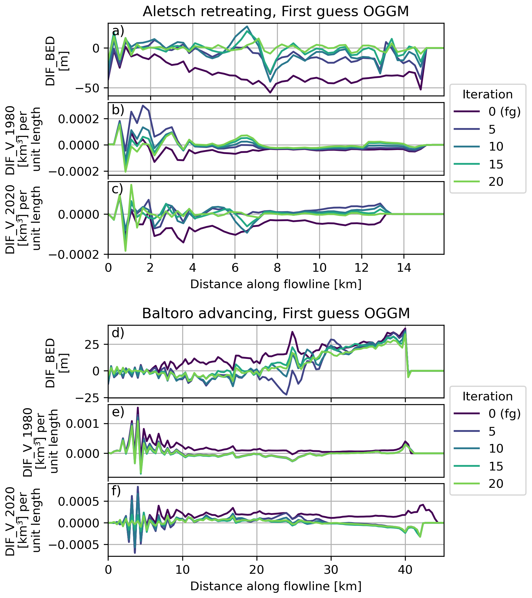 Figure 6 shows the differences between the modeled results and the synthetic truth along the flowline across iterations for the Aletsch-retreating and Baltoro-advancing cases. Specifically, it shows the difference in bed height (panels a and d), distributed volume in 1980 (panels b and e), and distributed volume in 2020 (panels c and f).