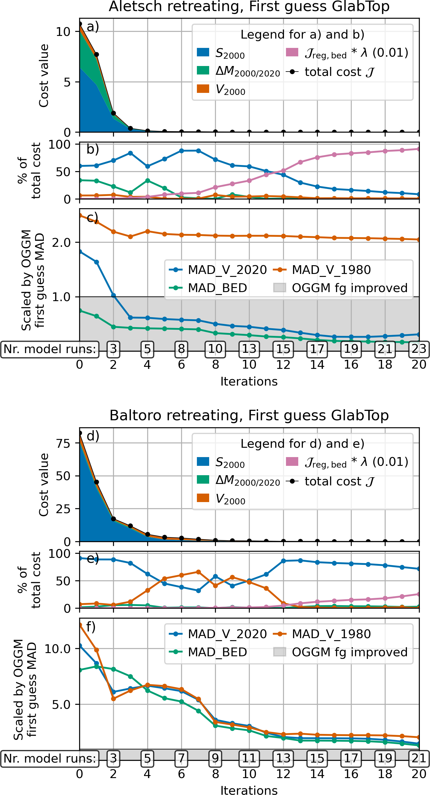 Figure 4Evolution of the cost function and performance metrics for Aletsch retreating (a to c) and equilibrium (d to f), starting from the OGGM first guess, with a λ value of 0.01. Panels (a) and (d) show the evolution of the cost function over minimization iterations, with individual cost terms represented in different colors. The relative contribution of the cost terms to the total cost is shown in panels (b) and (e). Panels (c) and (f) illustrate the evolution of performance metrics over the same iterations. The numbers in boxes along the x-axis indicate the total number of forward model runs required for each corresponding iteration.