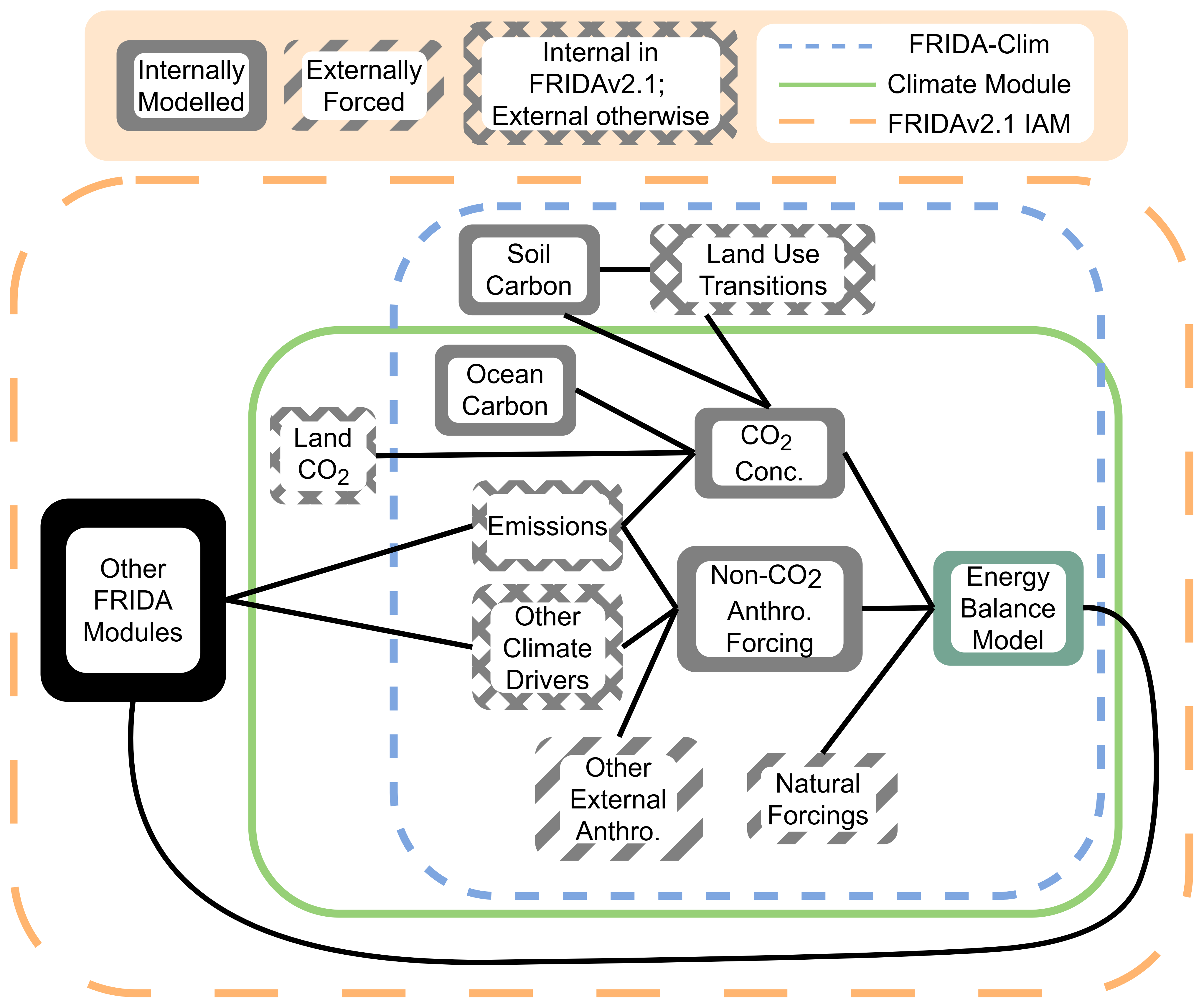 Figure 1Outline of the key components of the modelling framework, and the scope of each model. Components in grey boxes are calculated internally throughout the modelling framework, while striped boxes show quantities which are always externally provided. Hatched boxes are calculated endogenously in the fully-coupled FRIDAv2.1 IAM, but must be externally forced in the standalone FRIDA-Clim. Connections imply a causal link of the lefthand component on the righthand one, except the connection between the energy balance model (EBM) and the rest of the model. Anthro. = anthropogenic.
