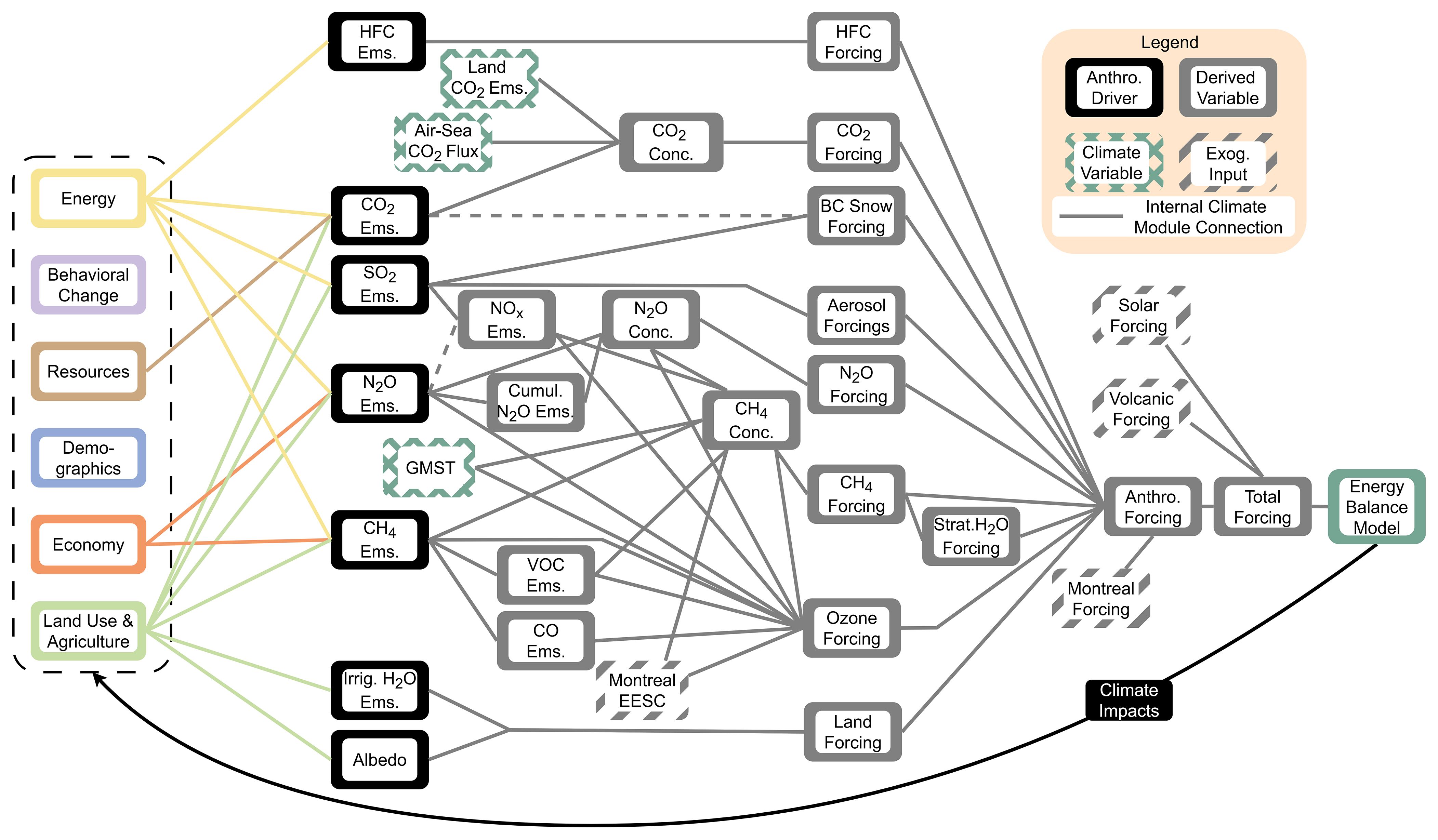 Figure 2Overview of the calculation of radiative forcings within this modelling framework; see Sect. 2.1–2.2 for details. Anthropogenic climate drivers (black) are interactively simulated within FRIDAv2.1 in the non-Climate modules as shown on the left and fed into the Climate Module; these drivers are externally provided to FRIDA-Clim when run as a standalone model. Similarly, climate impacts are only calculated in FRIDAv2.1, and then connected back to the rest of the IAM, completing the feedback loop between the components of the human-Earth system. The grey lines comprise the set of interactions modelled in FRIDA-Clim. Atmospheric variables calculated within the climate model are shown in grey boxes, with internal climate feedbacks shown with green hatched boxes. Striped grey boxes denote exogenously imposed variables. The total radiative forcing feeds into the energy balance model. Information flows from left to right; the coloured and grey lines denote an influence of the left connection onto the right one. Dashed lines indicate that a subset of the left connection is used as the influencer, with both cases relating to the regression-based predictions (see Sect. 2.1).