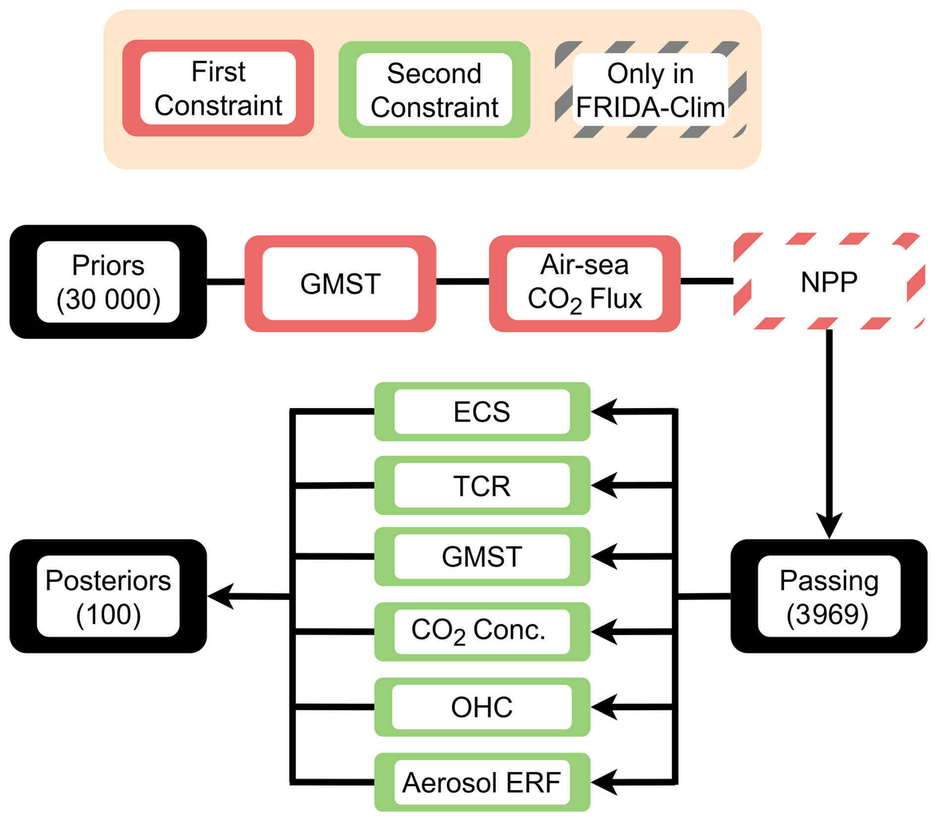 Both FRIDA-Clim and the Climate Module are calibrated to ensure consistency with historical temperatures and air-sea CO2 fluxes, as well as present-day best-estimates of aerosol forcings, temperature, CO2 concentration, and OHC change, and the intrinsic ECS and TCR climate properties. In addition, FRIDA-Clim is constrained on observed NPP data, and checked for agreement with observations of the terrestrial carbon balance and land carbon sink. Because of the lightweight nature of this calibration, these inputs can be easily updated and the model recalibrated as new data becomes available, as can the emissions timeseries used as inputs to the calibration. The default sizes of the spinup, prior, and posterior ensembles can also be modified as desired.