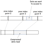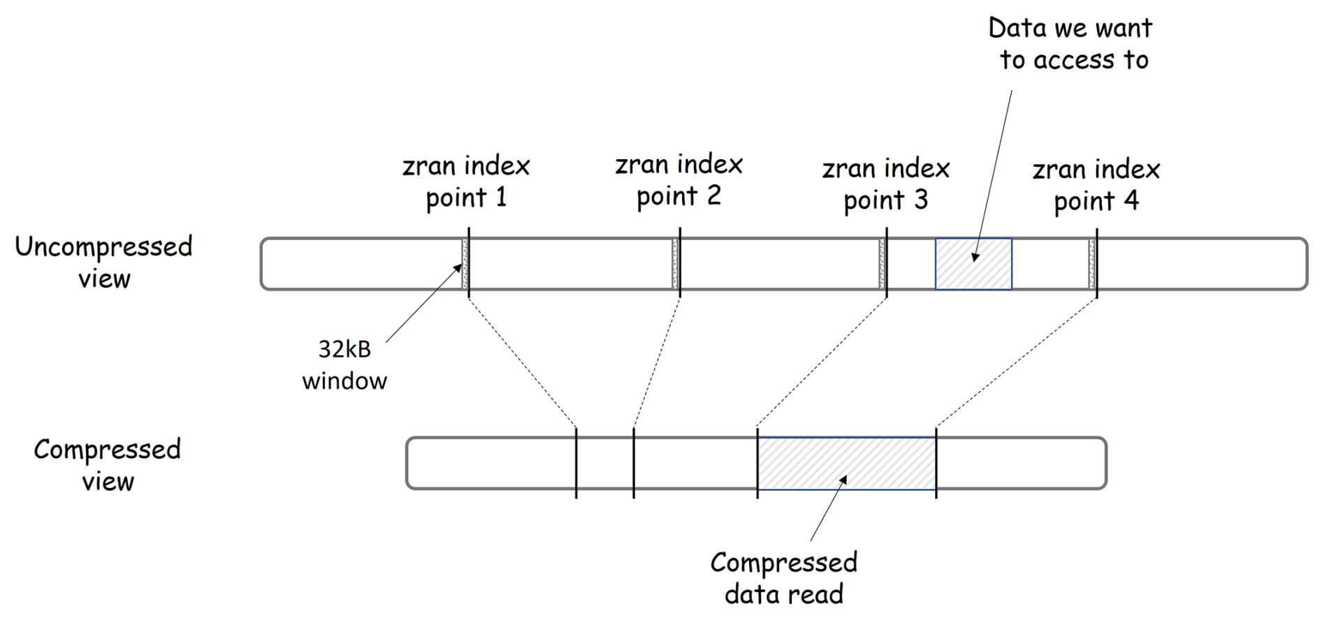 Figure 3 illustrates the principles of zran index points with two views of the same data: the uncompressed data view and the compressed data view. The chunk is depicted as a line segment. It is a sequence of bytes read from left to right. The line segment is shorter in the compressed view (bottom) than in the uncompressed view (top) to reflect a compression ratio greater than 1. Four index points are shown. They are evenly distributed in the uncompressed chunk but not in the compressed chunk due to deflate variable-length compression. A subset of data is represented as a hashed section in the uncompressed view. Its location is fully defined by an offset and a length. Thanks to the zran index points, it is not necessary to read and decompress the entire chunk to access this subset of data, but only the section that overlaps this subset between two index points. The chunkindex package identifies the locations of the previous and next index points. It fetches the corresponding location in the compressed version of the chunk, initializes the zlib library with the window associated with the previous index point, reads only the compressed data in the section between the two index points, and performs the decompression of the subset. In Fig. 3, the chunkindex identifies that the subset of data is located between index points 3 and 4. It reads and decompresses only the data in the section between those two index points, i.e. the section hashed in the compressed view and returns the subset of data.