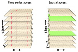 NetCDF-4 provides the capability of automatic chunking. This feature determines a chunking strategy based on the structure and size of the data. However, the chunk size and shape should be chosen taking into account the access patterns, i.e. the various manner the end-user may access the data, in order to minimize the number of disk I/O and the number of decompression operations. For instance, Fig. 1 represents a 3D variable with dimensions (x, y, time). Considering a chunking layout by time frame, i.e. one 2D spatial chunk per time, it would be required to read and inflate all chunks to work on a time series at one given spatial point (left of Fig. 1). However, only one chunk needs to be read and decompressed to work on a spatial frame at a given time t (right of Fig. 1).