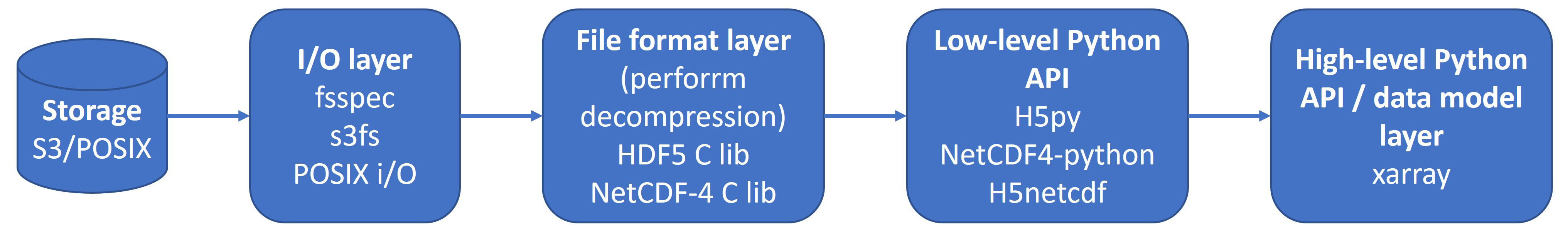 At the lowest level, the I/O layer depends on the storage backend, the HDF5 C library handles all I/O operations, chunk retrieval, and decompression. Built on top of HDF5, the netCDF-4 C library adds the netCDF data model, including dimensions, coordinate variables, and attribute conventions.
