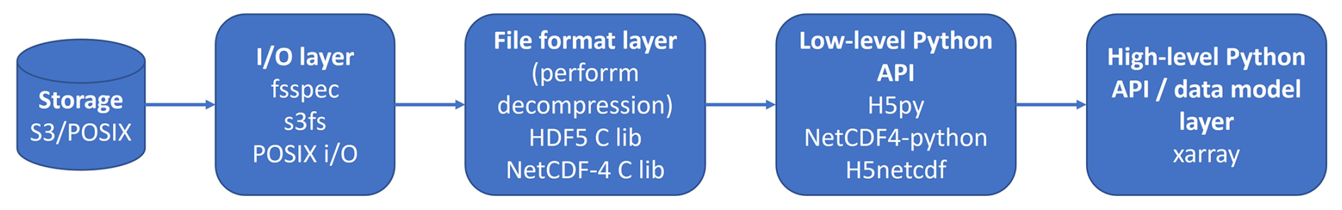 All Python libraries evaluated in this study for reading netCDF-4 files rely on the HDF5 C library for actual I/O operations and decompression. The Fig. 2 shows the software stack:
