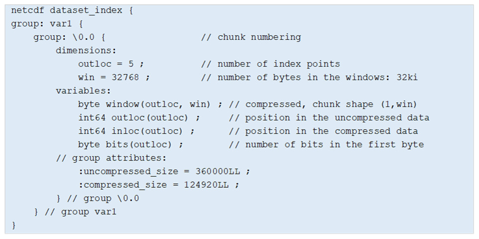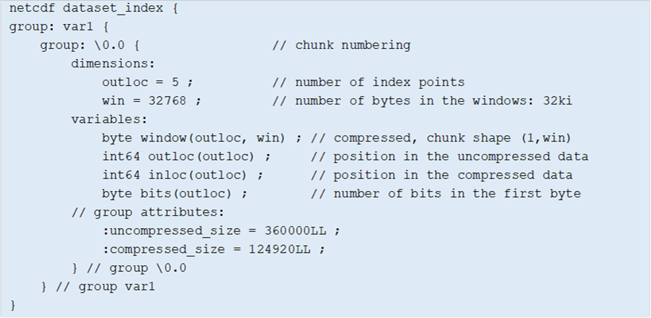 The index is stored in a netCDF-4 data structure to access the index points efficiently. The windows are compressed to reduce the index data volume. Figure 4 provides an example created for a hypothetical netCDF-4 dataset that contains a variable “var1” with one chunk numbered “0.0” to illustrate the index data structure. In this example, the index contains five points as indicated by the dimension outloc. The index windows are stored as a 2D variable window of dimensions (outloc, win) where win is the window size i.e. 32 kB. This variable is chunked with a shape (1, win) for an efficient access to the window associated with each index point. It is compressed with deflate to reduce the data volume of the windows. The outloc and inloc variables store the position of the index points, respectively, in the uncompressed and compressed versions of the data. The variable bits indicates how many bits of the first byte read in the compressed stream are utilized to start the decompression. Indeed, data samples do not occupy full bytes when compressed. Last, the uncompressed_size and compress_size attributes convey the size of the chunk in its uncompressed and compressed versions.