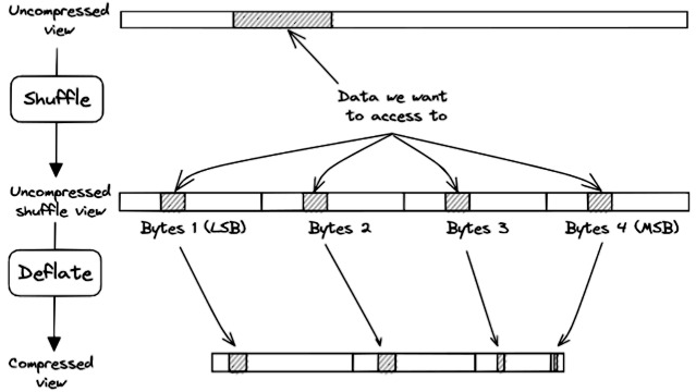 The process for decompressing the data gets more complicated when shuffling is applied prior to the compression. Shuffling is a popular pre-compression step in netCDF-4 because it allows increasing both the compression speed and the compression ratio of most scientific datasets (Hartnett and Rew, 2008). Shuffling aims to exploit potential redundancies within the data structure and enhance the compressibility of the dataset by reordering data bytes by significance within the chunk. The problem for the chunkindex package is that shuffling disperses the bytes of samples throughout the chunk. Figure 5 illustrates this problem for samples with a data type of 4 bytes (e.g. int32, float32). A subset of data is represented hashed in the uncompressed segment (top). Shuffle scatters the continuous subset of data in the shuffled version of the chunk (middle) and therefore, scatters the data in the compressed chunk (bottom). Consequently, the chunkindex package needs to read and decompress at least four sections of the compressed chunk to be able to reconstruct the continuous subset. This clearly affects the performance of the chunkindex solution because it needs to retrieve more index points and read more compressed data to reconstruct the subset of data.