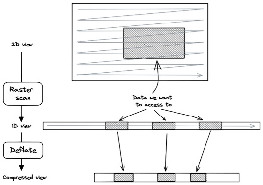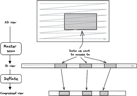A similar problem occurs when accessing a multi-dimensional subset in a multi-dimensional chunk stored in raster-scan order. Figure 6 illustrates this problem in the 2D case. The connected subset of data is scattered in the compressed chunk. The number of compressed data sections required to reconstruct the connected subset increases with the dimensions. Consequently, the chunkindex package needs to read and decompress more sections of the compressed chunk to reconstruct the connected subset, once again affecting the performance of the chunkindex. The performance is further affected when multi-dimensional datasets are compressed with shuffle.