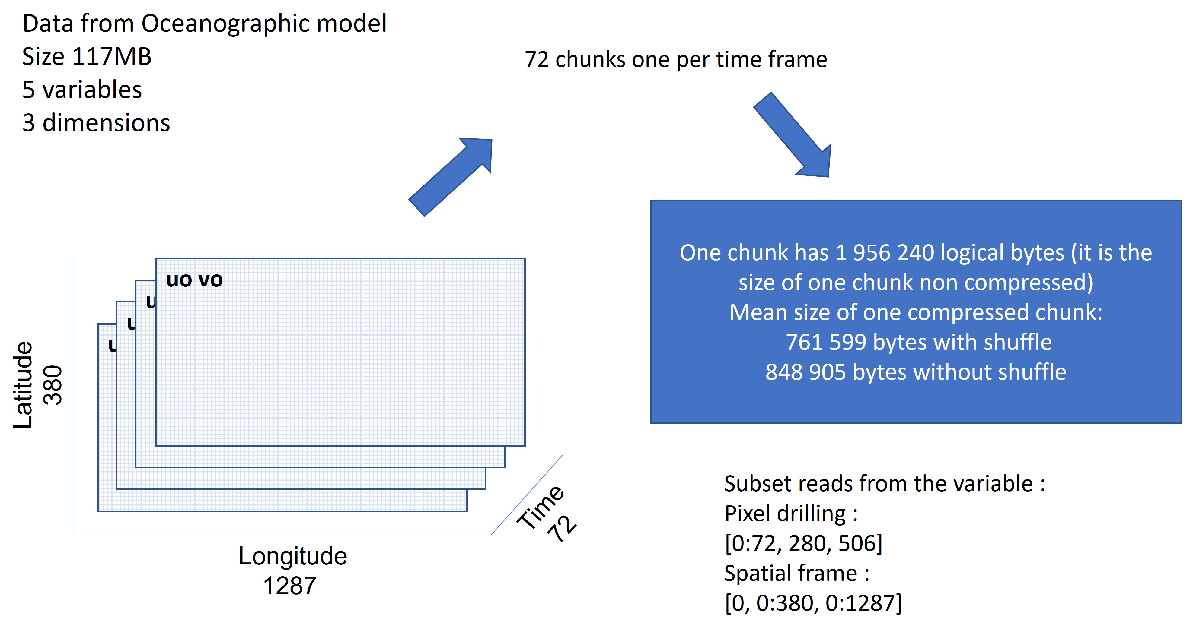 Figure 7 shows the structure of the files coming from the 3D oceanographic model output from Copernicus Monitoring Environment Marine Service (CMEMS). The variable uo is a 3D variable with one temporal dimension (time) and two spatial dimensions (lat, lon) with the dimension length of time: 72, lat: 380 and lon: 1287. It contains 72 chunks of 1.9 MB uncompressed. One chunk is a spatial frame of dimensions (lat, lon).