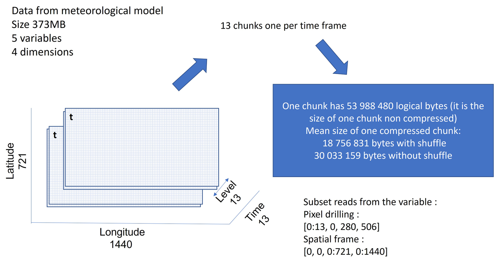 The netCDF-4 format provides chunking capabilities that are crucial for performance (Lee et al., 2008). Chunking consists of dividing the data into small, independent units called chunks. A chunk is read or written in a single I/O operation. This principle optimizes data retrieval and storage within netCDF-4 formatted files, particularly for large datasets. In netCDF-4, the chunks can be accessed and decompressed individually allowing efficient data access and manipulation. Compressed variables or variables with an unlimited dimension are necessarily chunked. When a request is made to retrieve a specific piece of data from a netCDF-4 file, specifying a specific subset of dimensions, variables, or indices, the netCDF-4 library determines which chunks are necessary to fulfil the request and retrieves only the relevant chunks from the file.