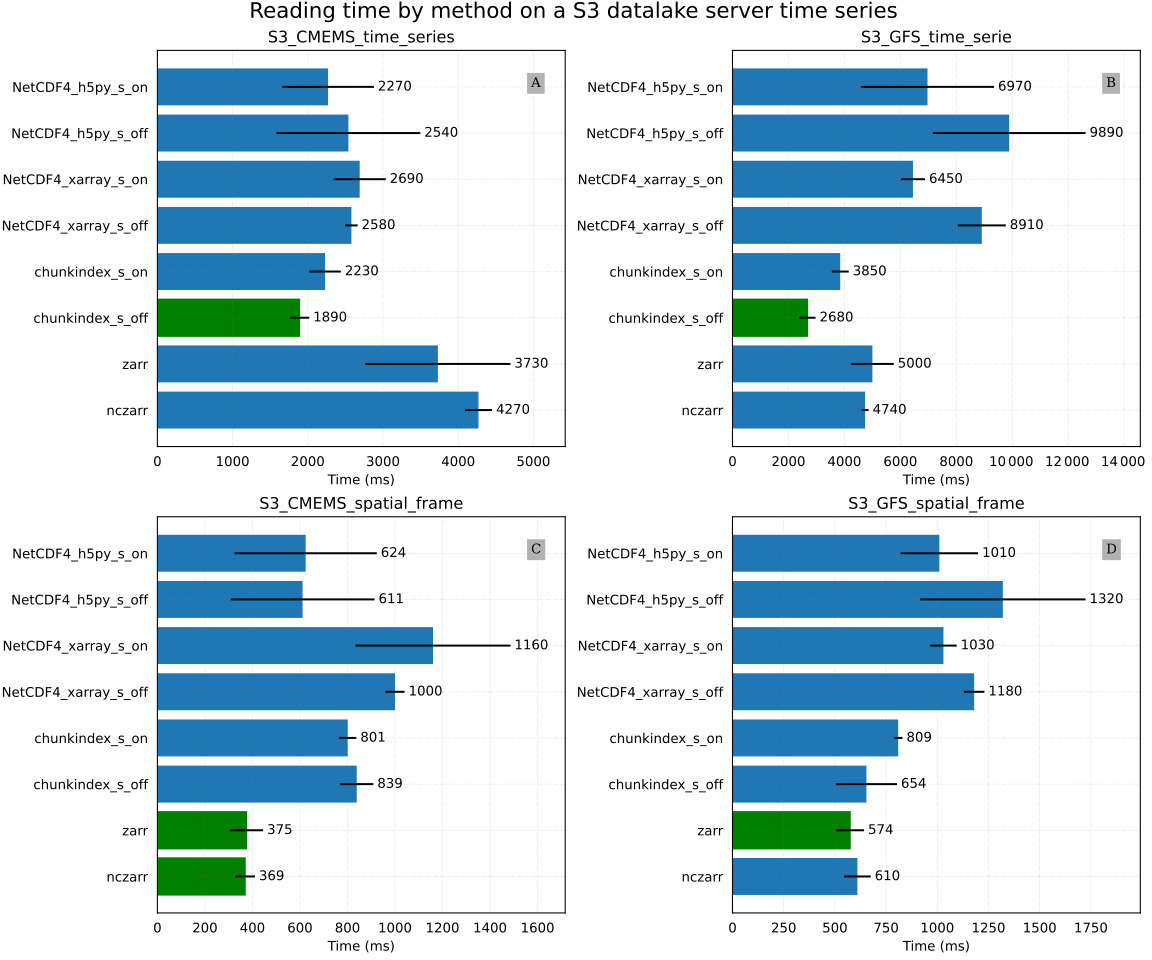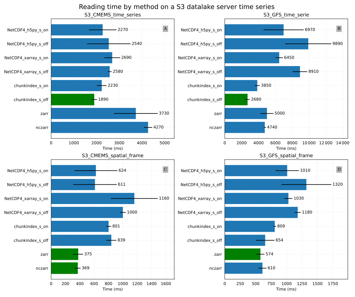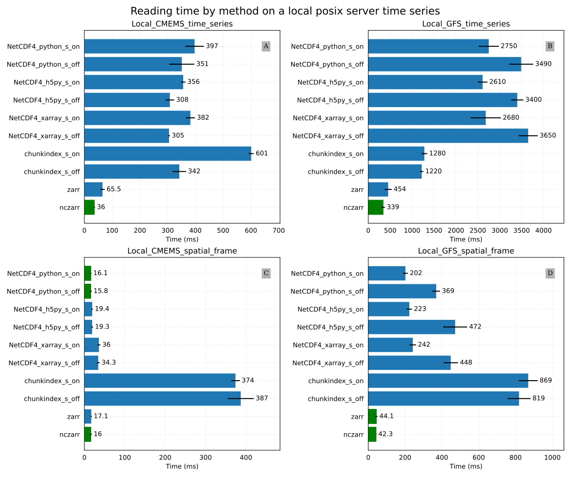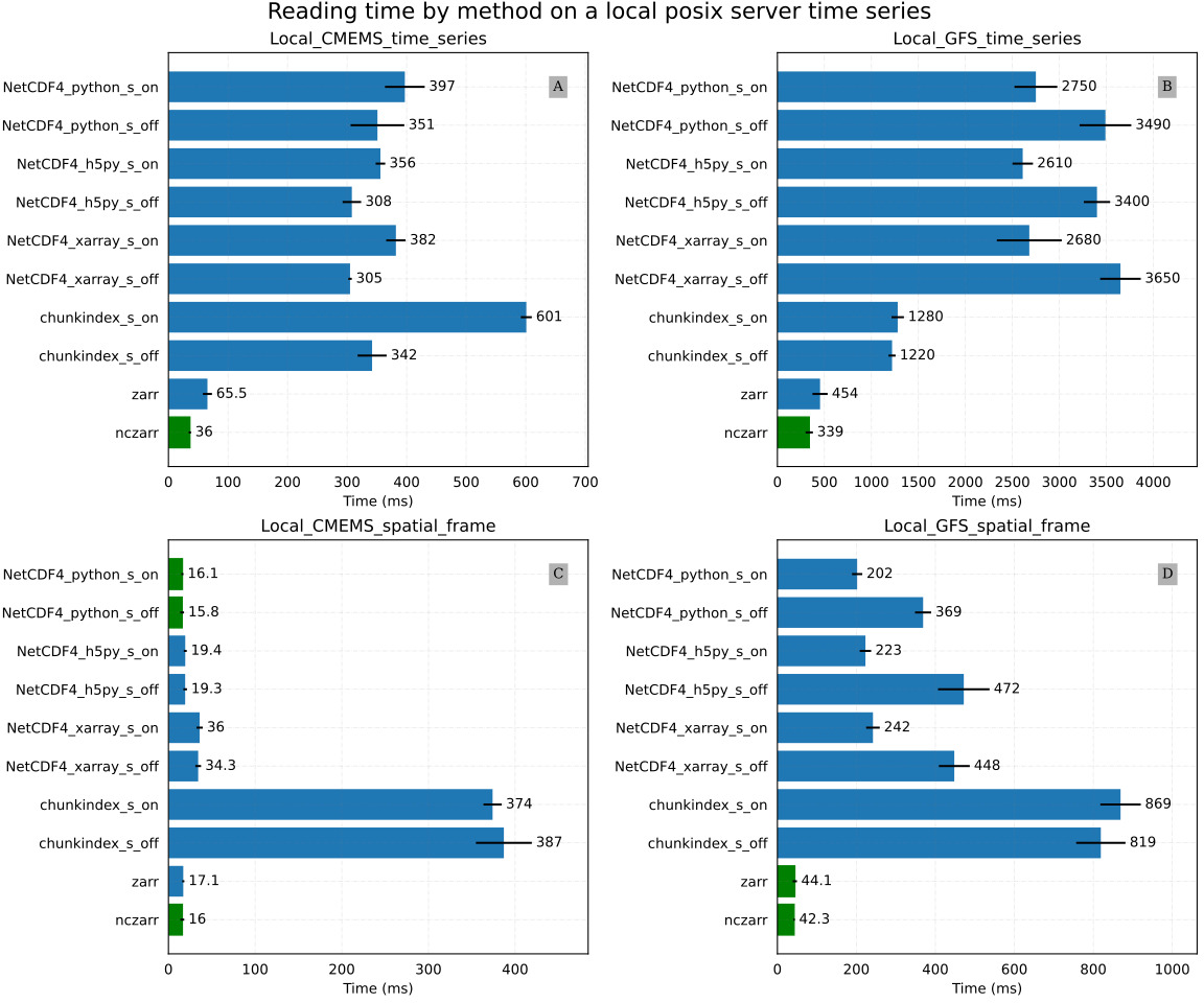 Figure 9C and D provide results of the Local_CMEMS_spatial_frame and the Local_GFS_spatial_frame experiments respectively. In the Local_CMEMS_spatial_frame experiment, a full chunk is read. In the Local_GFS_spatial_frame experiment, only a small portion of the file is read. The chunkindex package is clearly the worst solution in both cases. The performance of the chunkindex package is penalized by the time required to read the index file. The performance of the other libraries is the same order of magnitude for Local_CMEMS_spatial_frame. Nevertheless, it may be noticed that Zarr and ncZarr are faster than the other libraries in the Local_GFS_spatial_frame. This is due to the same reason as the results of the Local_GFS_time_series experiment: the size of NetCDF chunk is large (about 18 MB).