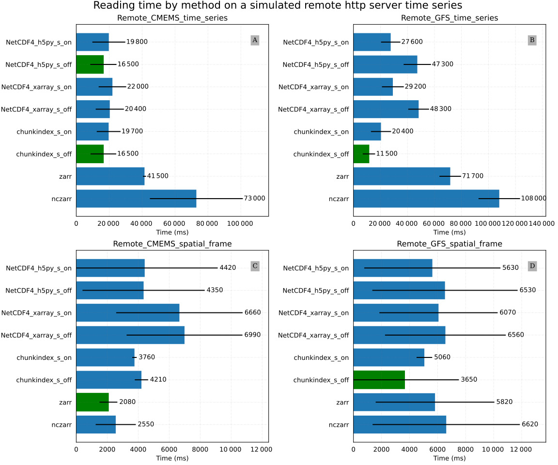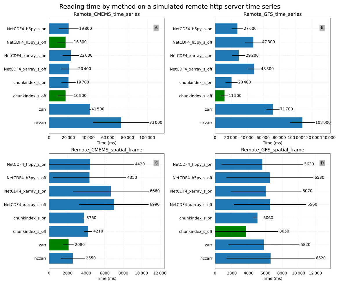 Figure 10A and B provide the results of the Remote_CMEMS_time_series and Remote_GFS_time_series experiments respectively. In the Remote_CMEMS_time_series experiment, chunkindex performance is comparable to the performance of h5py. Chunkindex is faster in the Remote_GFS_time_series experiment in which the netCDF-4 file is created with big chunks. Zarr and ncZarr are slower in both cases.