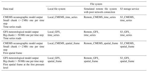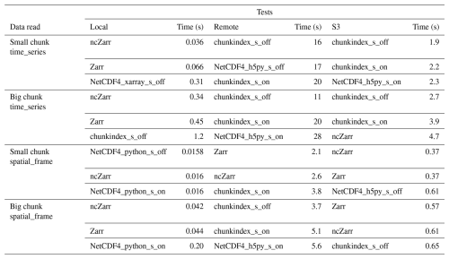 It can be observed that reading a time series of only 72 values in the Local_CMEMS_time_series experiment takes more than 0.4 s (Fig. 9A), whereas reading a spatial frame of 489 060 values in Local_CMEMS_spatial_frame experiment (Fig. 9C) can take less than 0.02 s. This is due to the chunking structure of the dataset, which favour the performance for accessing spatial frames in this case: the access to a time series requires reading and decompressing all chunks of the dataset whereas the access to only one spatial frame requires reading and decompressing only one chunk. This example shows that the chunking structure has to be adapted to the most commonly utilized reading pattern by users.