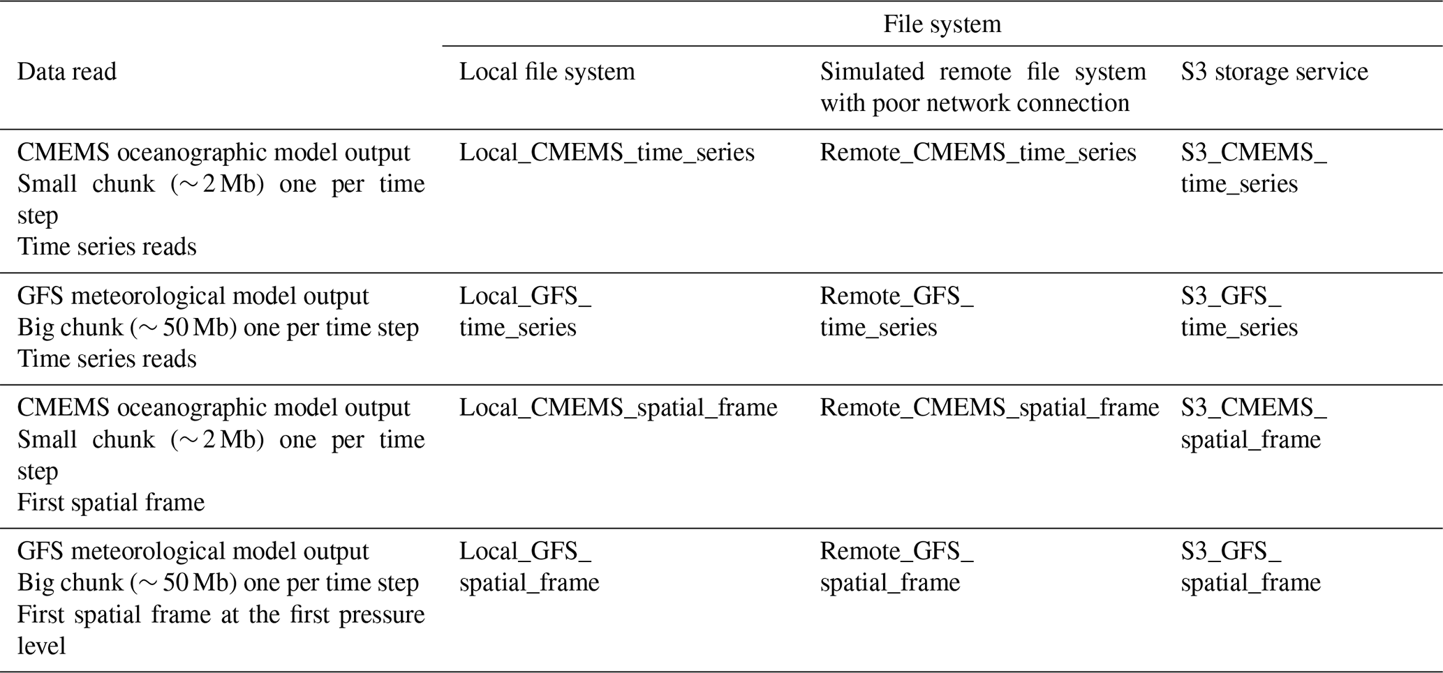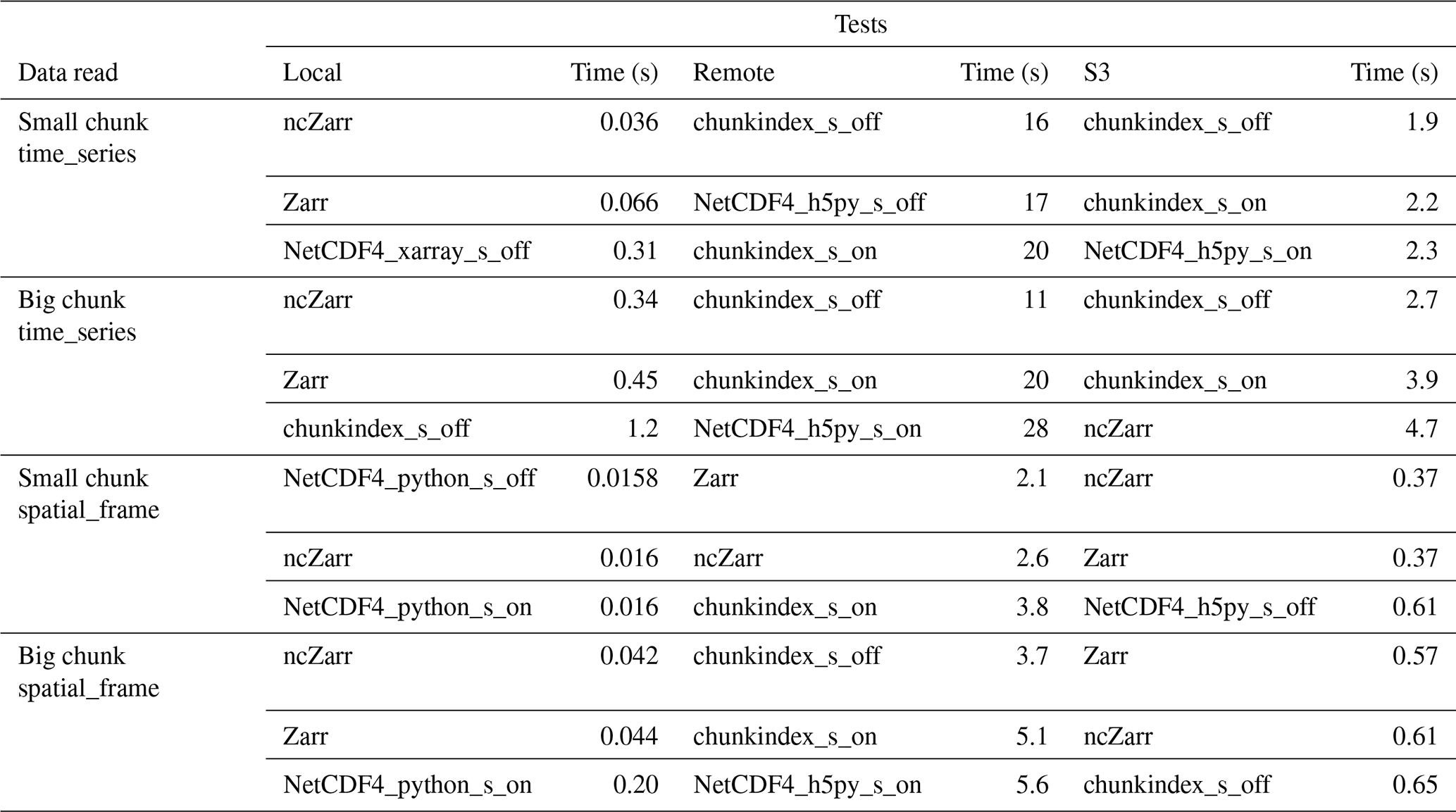 Zarr and ncZarr versions of this dataset are also generated from these netCDF-4 files with the same content and the same chunking structure. Within Zarr, the default compression method is activated: the meta-compression Blosc with LZ4 compressor at level 5 and shuffle activated. This choice reflects typical real-world usage, as most users rely on default settings when converting data to the Zarr format. However, it should be noted that LZ4 decompression is generally faster than deflate decompression, which may contribute to Zarr's performance advantage in some of our experiments. Using deflate compression within Blosc would have provided a more direct comparison with the deflate-compressed netCDF-4 files. We did not manage to activate the internal compression in ncZarr (problem in our version during the tests, probably fixed now). Hence, the ncZarr dataset is neither compressed nor shuffled. Table 1 below provides the file size in the different formats. In this table, the data volume of the ncZarr dataset is provided with external zip compression.
