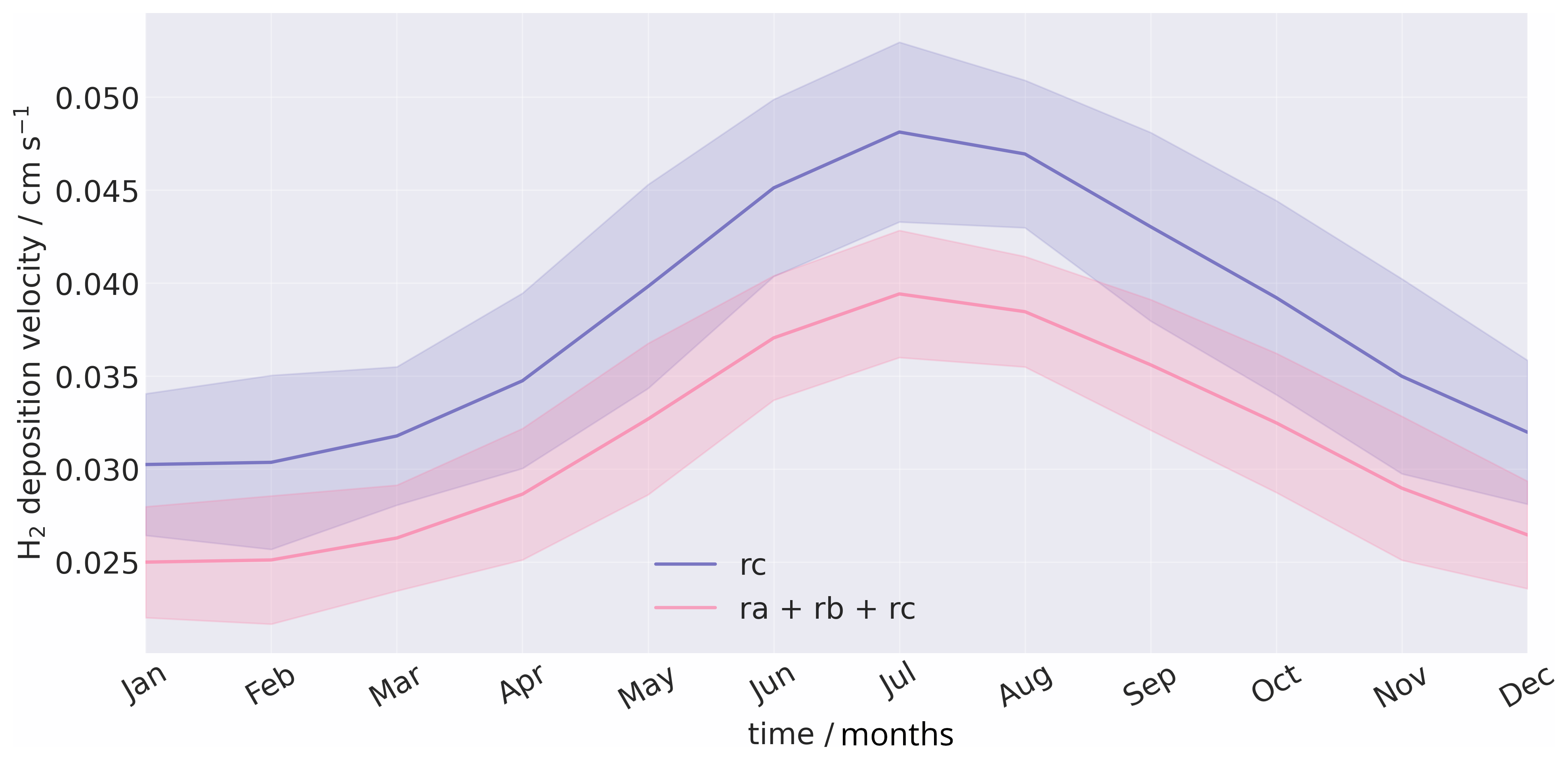 Figure 1Monthly, land averaged hydrogen deposition velocity for simulation TR-H2-flux (H2 Flux; CH4 LBC) between 1982–2013 with all resistances (pink) and with only hydrogen deposition velocity (purple). Shaded areas indicate two standard deviations.