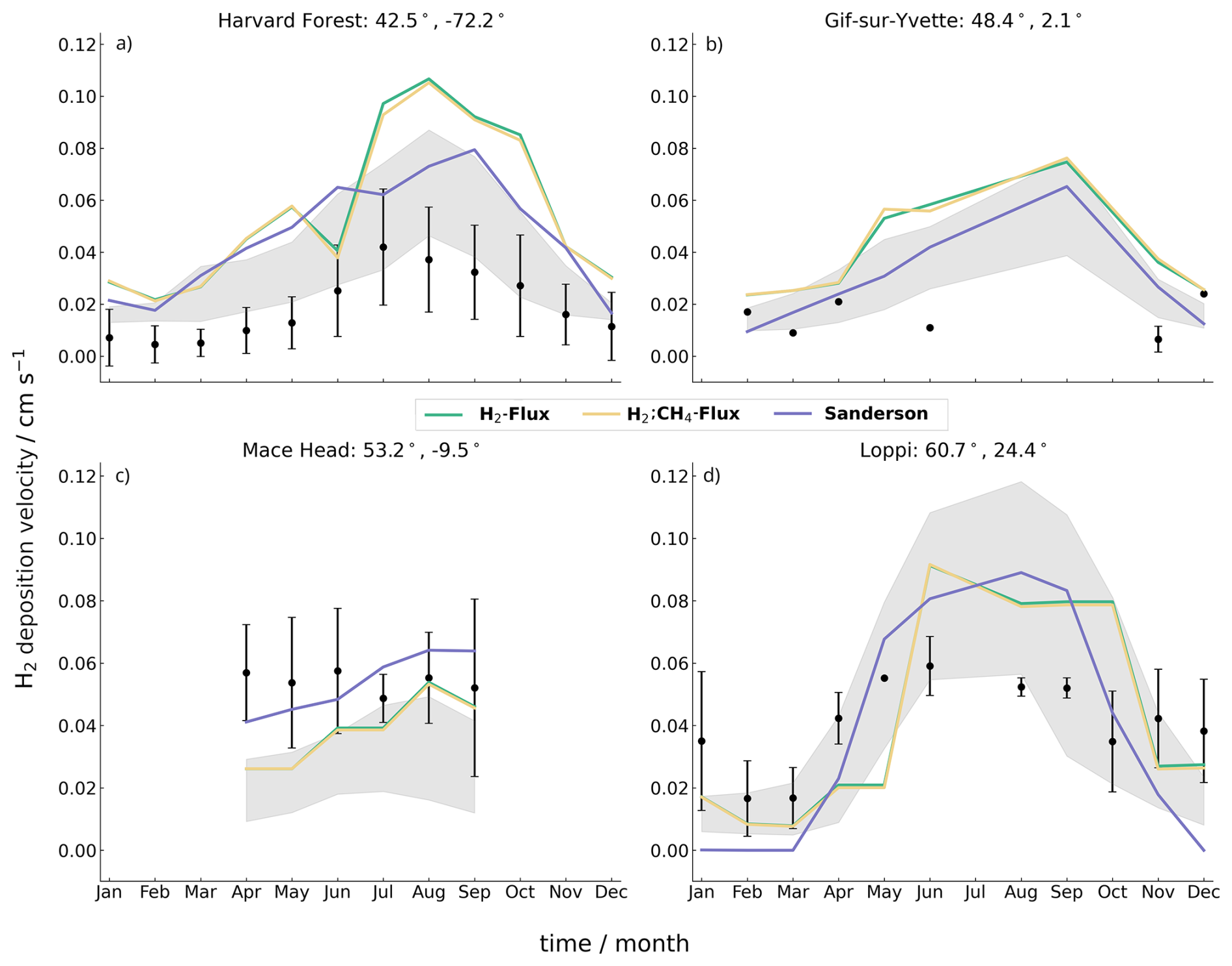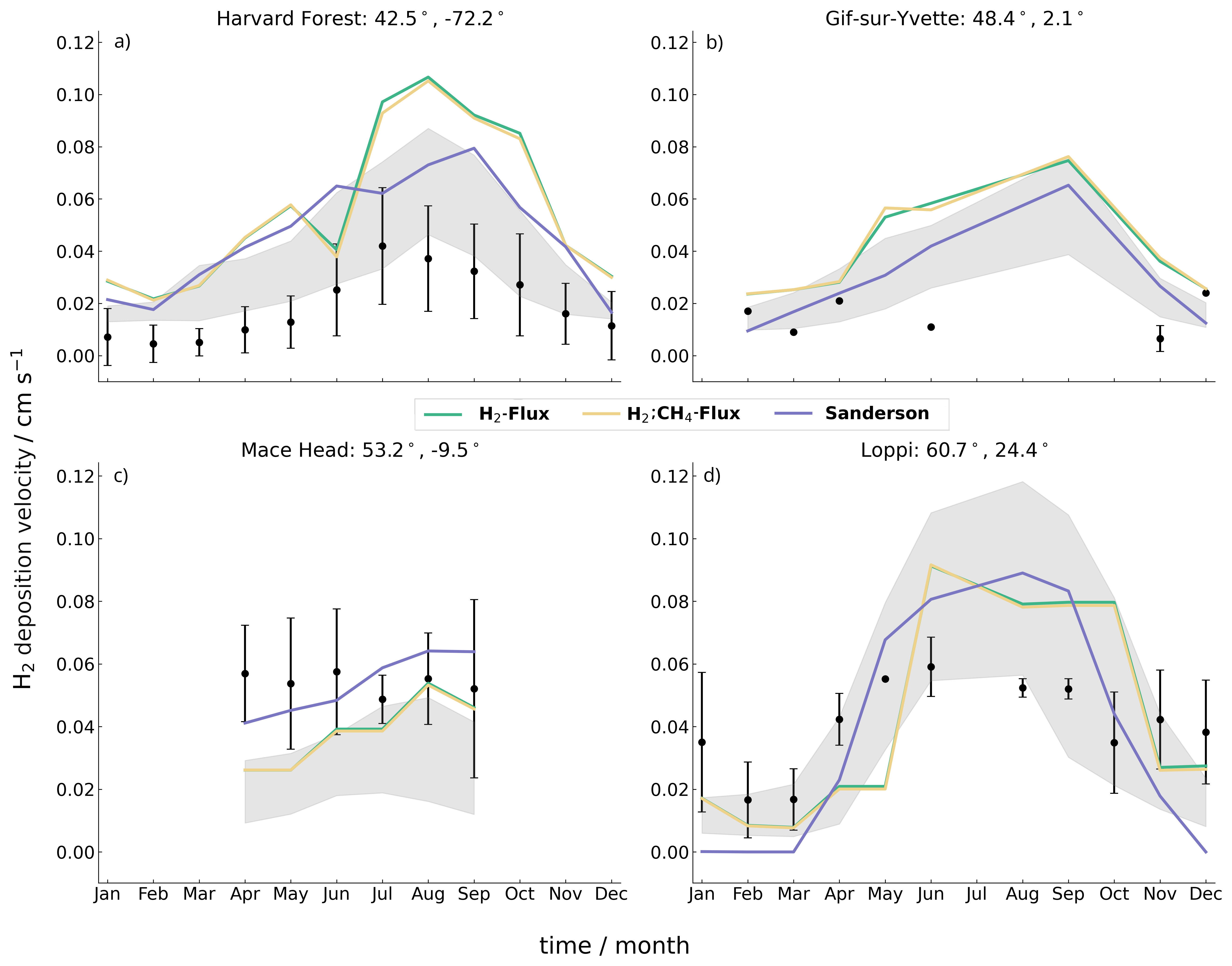 Figure 3Monthly mean observed hydrogen deposition velocities averaged across years where possible (points) compared with (green) TR-H2-flux, (yellow) TR-H2CH4-flux, and (purple) Sanderson simulated velocities for (a) Harvard Forest (2010–2012; Meredith et al., 2017), (b) Gif-sur-Yvette (2011; Belviso et al., 2013), (c) Mace Head (1995–2008; Simmonds et al., 2011), and (d) Loppi (2004–2006; Lallo et al., 2008). Error bars show one standard deviation across years. Shaded areas show the range of deposition velocities from CMIP6 model inputs calculated in Brown et al. (2025).