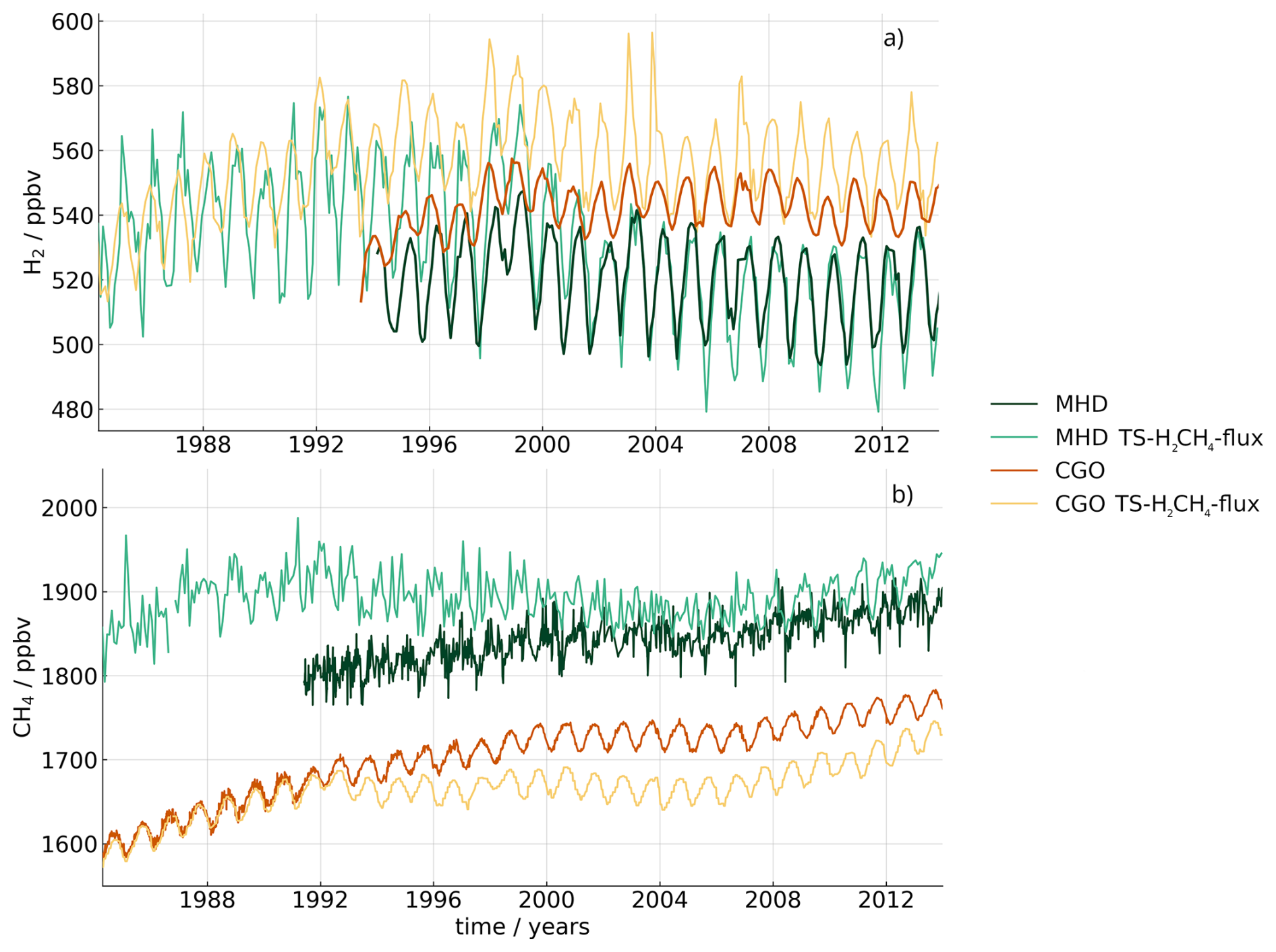 Figure 4Time series of Mace Head for (MHD: dark green) observations and (light green) TR-H2CH4-flux simulation, and Cape Grim (CGO: orange) observations and (yellow) TR-H2CH4-flux for (a) hydrogen (observations: 1994–2013) and (b) methane (observations: 1985–2013).