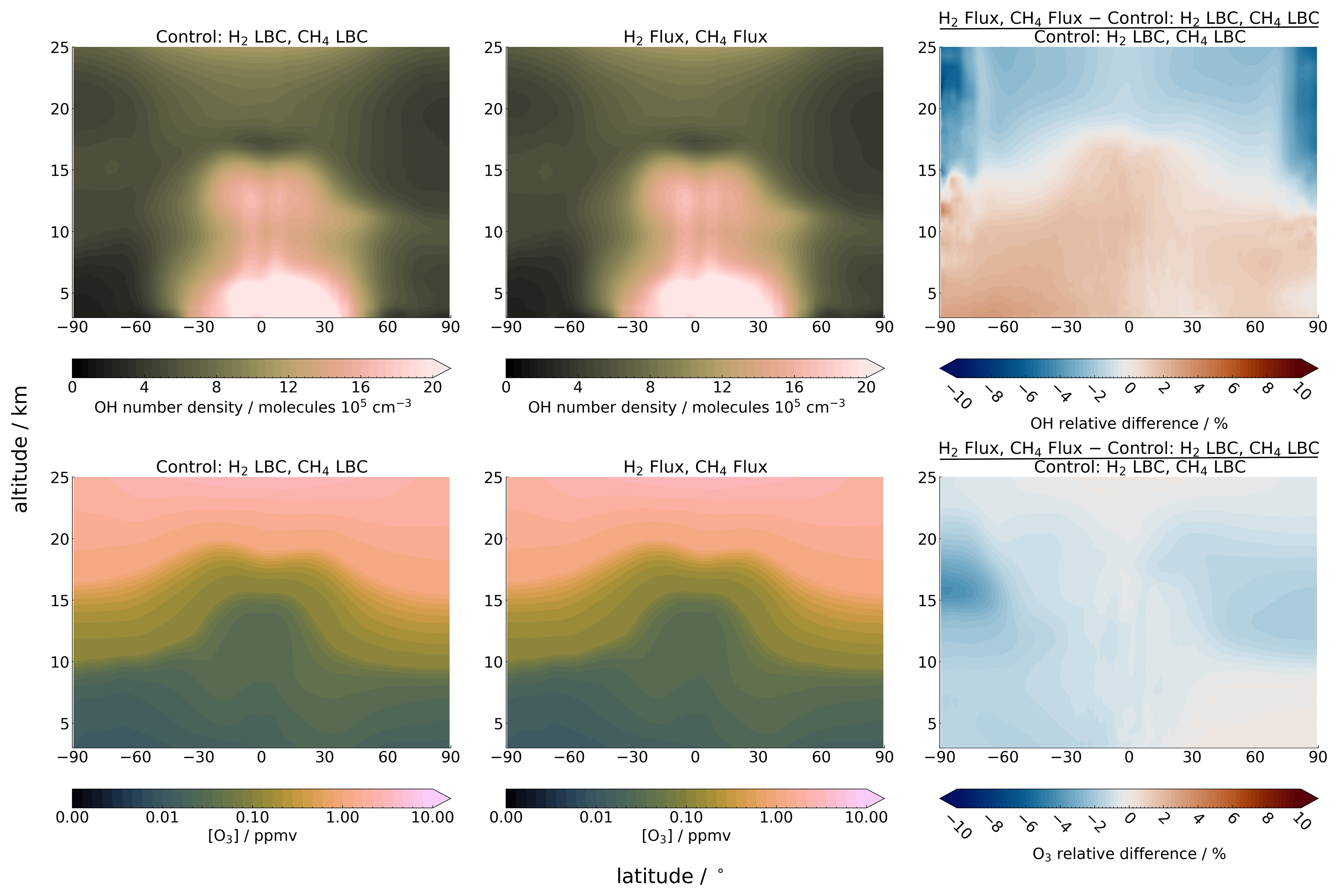 Figure 6Zonally averaged (top) OH concentration and (bottom) ozone mixing ratio for the (left) control simulation, (middle) TR-H2CH4-flux simulation, and (right) the relative difference between the two ((TR-H2CH4-flux − Control)Control) averaged between 2008–2013. Red (blue) shows an increase (decrease) from the control.