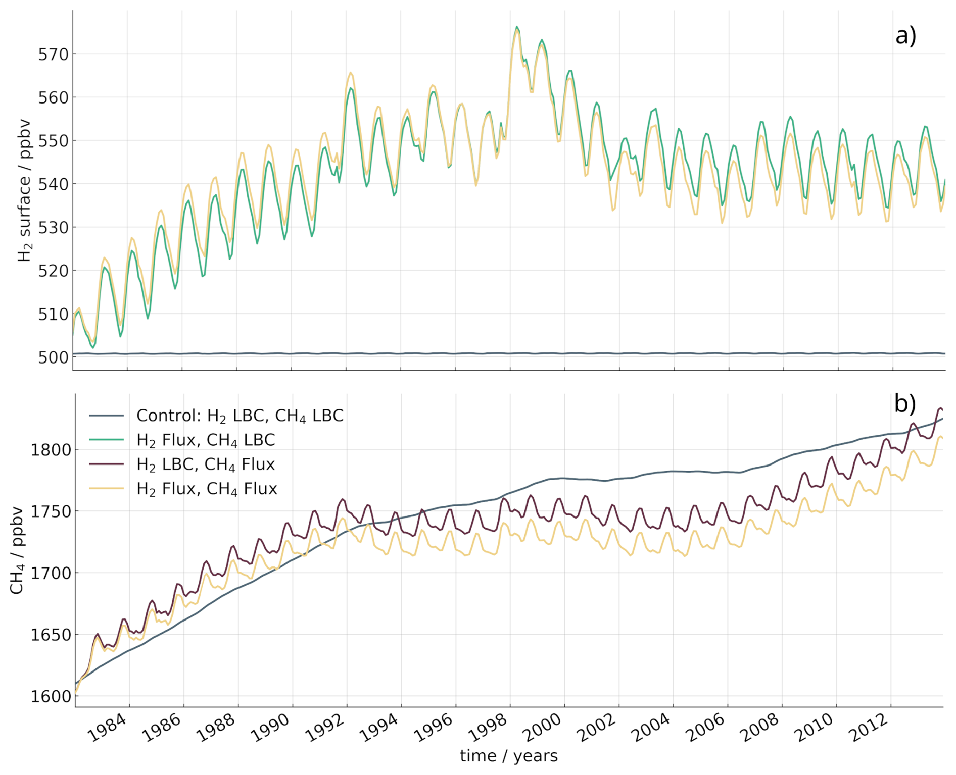 Figure 7(a) Globally averaged surface hydrogen from the (grey) control, (green) TR-H2-flux, and (yellow) TR-H2CH4-flux simulations from 1982 to 2013. Both the control and the TR-CH4-flux simulation have hydrogen set to 500 ppbv at the surface. (b) Globally averaged surface methane from the (grey) control, (red) TR-CH4-flux, and (yellow) TR-H2CH4-flux simulations.