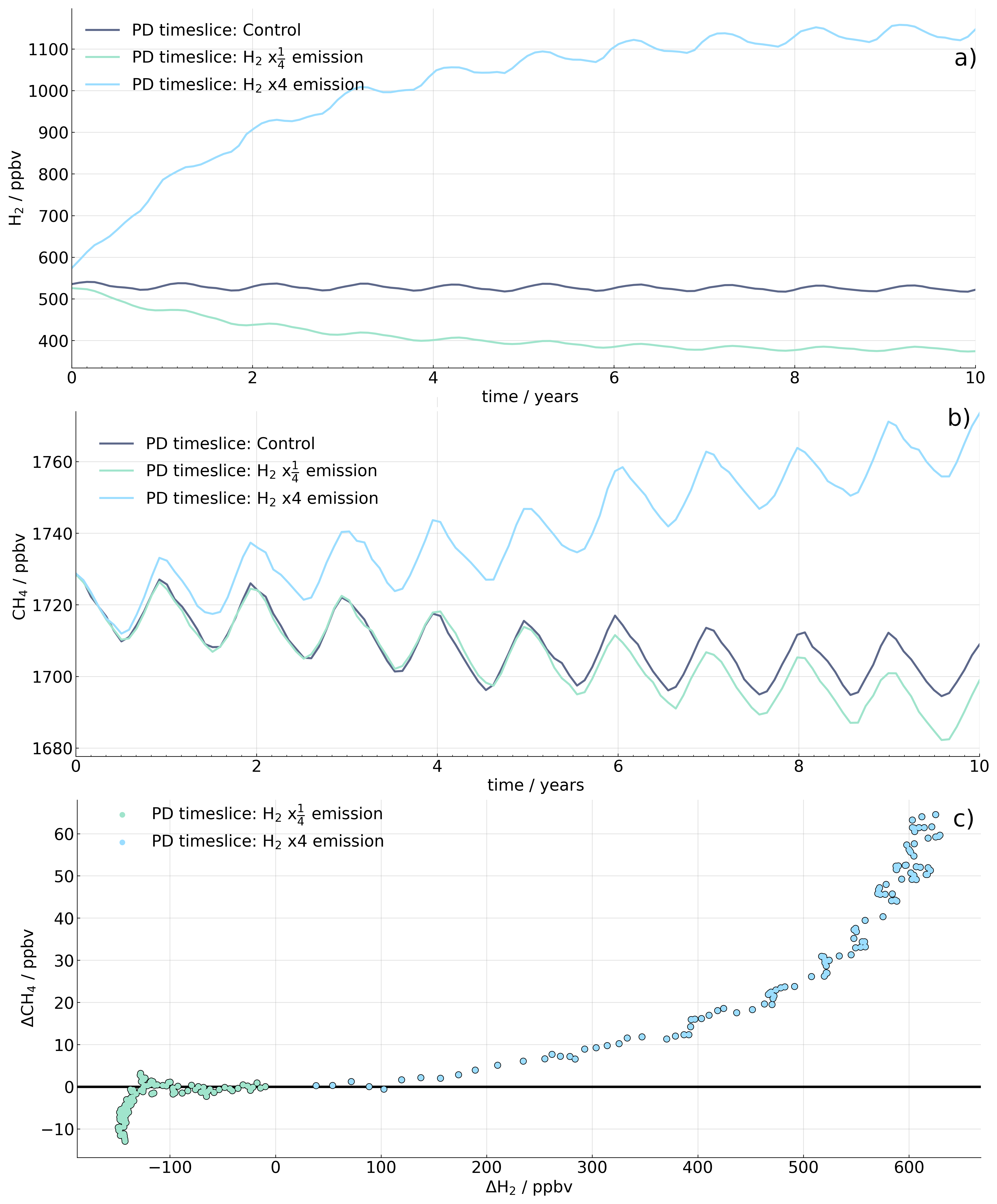 Figure 9Global monthly averaged (a) H2 and (b) CH4 surface mixing ratios of the (dark blue) control, (green) H2 emissions, and (light blue). (c) Difference between the control PD timeslice and the perturbed H2 emissions simulations (perturbed emissions – control). Black line indicates no difference from the control. Timeslices are for 2020.