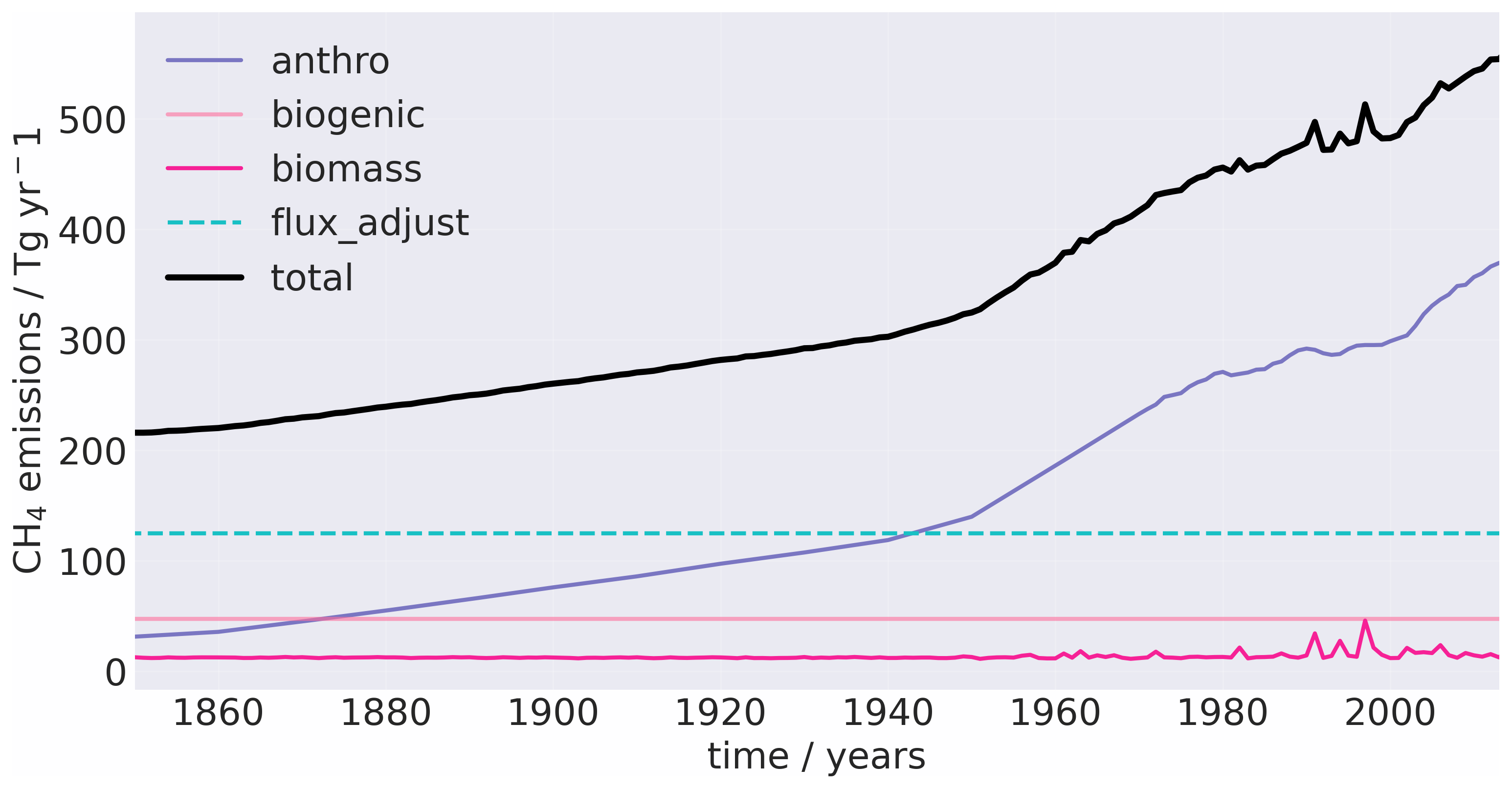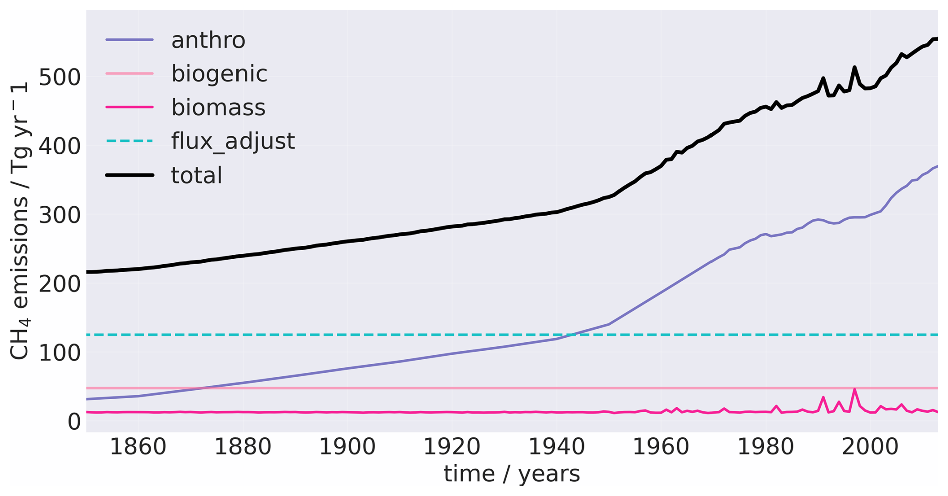 Figure A1Yearly, globally averaged methane emissions from 1850–2014 (excluding wetlands). The flux adjustment is that used in the nudged simulations and is a total 124 CH4 Tg yr−1.