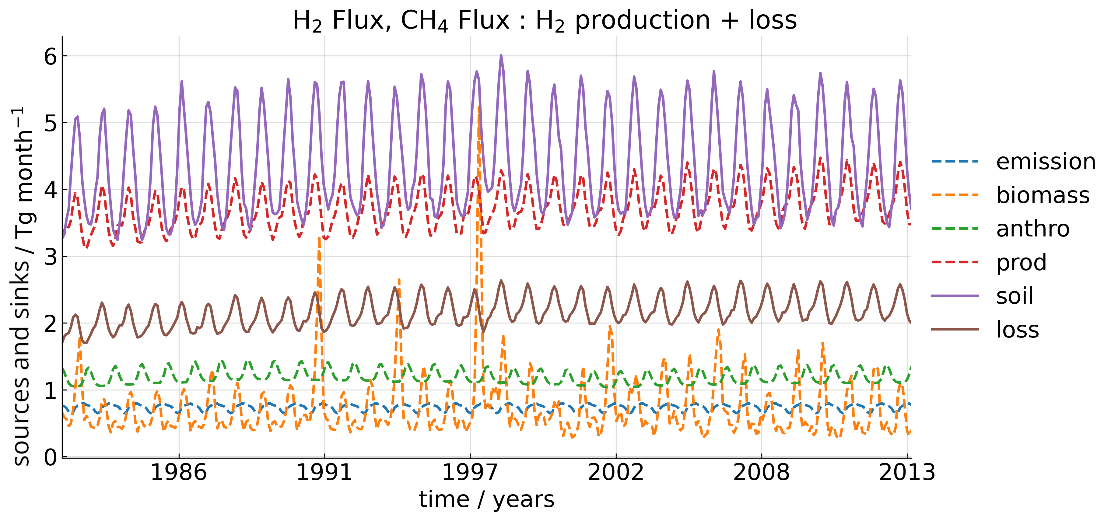Figure A2Globally averaged monthly hydrogen sources and sinks from 1982–2013. “emission” refers to the natural hydrogen emissions both from the ocean and land. “prod” and “loss” refers to the atmospheric chemical production and loss of H2 respectively.