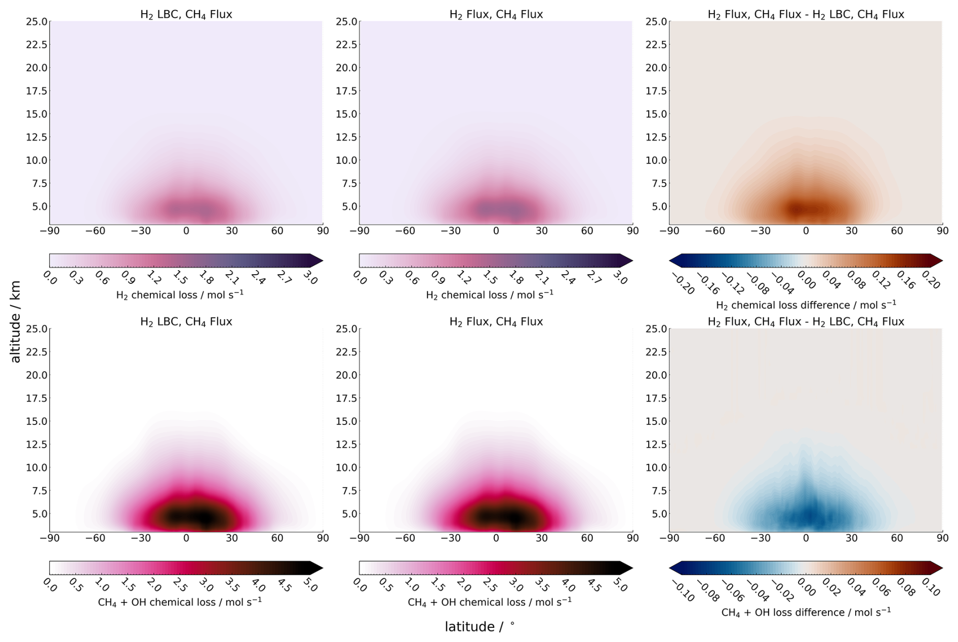 Figure A3Zonally averaged (top) H2 chemical loss and (bottom) CH4 loss via OH for (left) TR-CH4-flux simulation, (middle) TR-H2CH4-flux simulation, and (right) difference between the two (CH4-flux − TR-H2CH4-flux) averaged between 2008–2013. Red (blue) shows an increase (decrease) from the TR-CH4-flux. Note the non-linearity of scales.