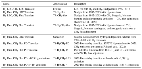 The NOAA methane and hydrogen data is available from https://www.gml.noaa.gov/dv/iadv/ (last access: 5 June 2025). Data from all simulations are found at https://doi.org/10.5281/zenodo.15574652 (Brown, 2025).