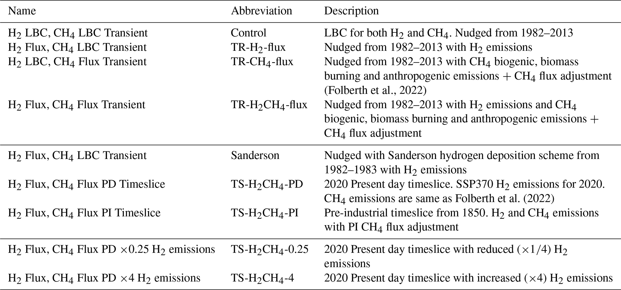 (Folberth et al., 2022)Folberth et al. (2022)Table 1List of simulations. Present day and pre-industrial simulations have been spun up for 30 years. LBC = Lower Boundary Condition, Flux = interactive tracer with emissions and uptake, PD = Present day, PI = Pre-industrial, TS = Time Slice, TR = Transient.