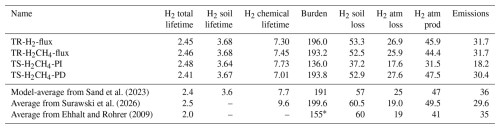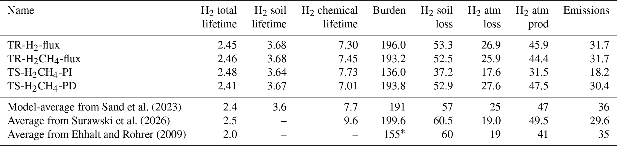Sand et al. (2023)Surawski et al. (2026)Ehhalt and Rohrer (2009)Table 2Hydrogen lifetime and budget of different simulations. Present day and pre-industrial timeslices are averaged over the last 5 years, nudged runs are averaged between 2008–2013. Lifetime is given in years. Burden is in Tg, while chemical production, chemical loss, and emissions are given in Tg yr−1.