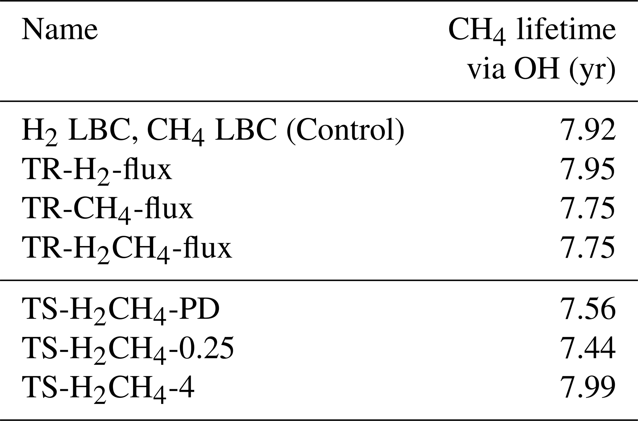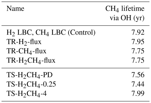Hydrogen lifetime is similar between all simulations, ranging between 2.41–2.48 years. The soil lifetime remains constant, while the lifetime from chemical loss reactions fluctuates between 7.01–7.73 years. Soil lifetime is expected to produce similar values between all runs, as the deposition is calculated through soil properties and is independent of hydrogen. In Sand et al. (2023), soil lifetime was estimated from prescribed H2 LBC values and both the soil and total model-averaged hydrogen lifetimes are similar to values in this work.